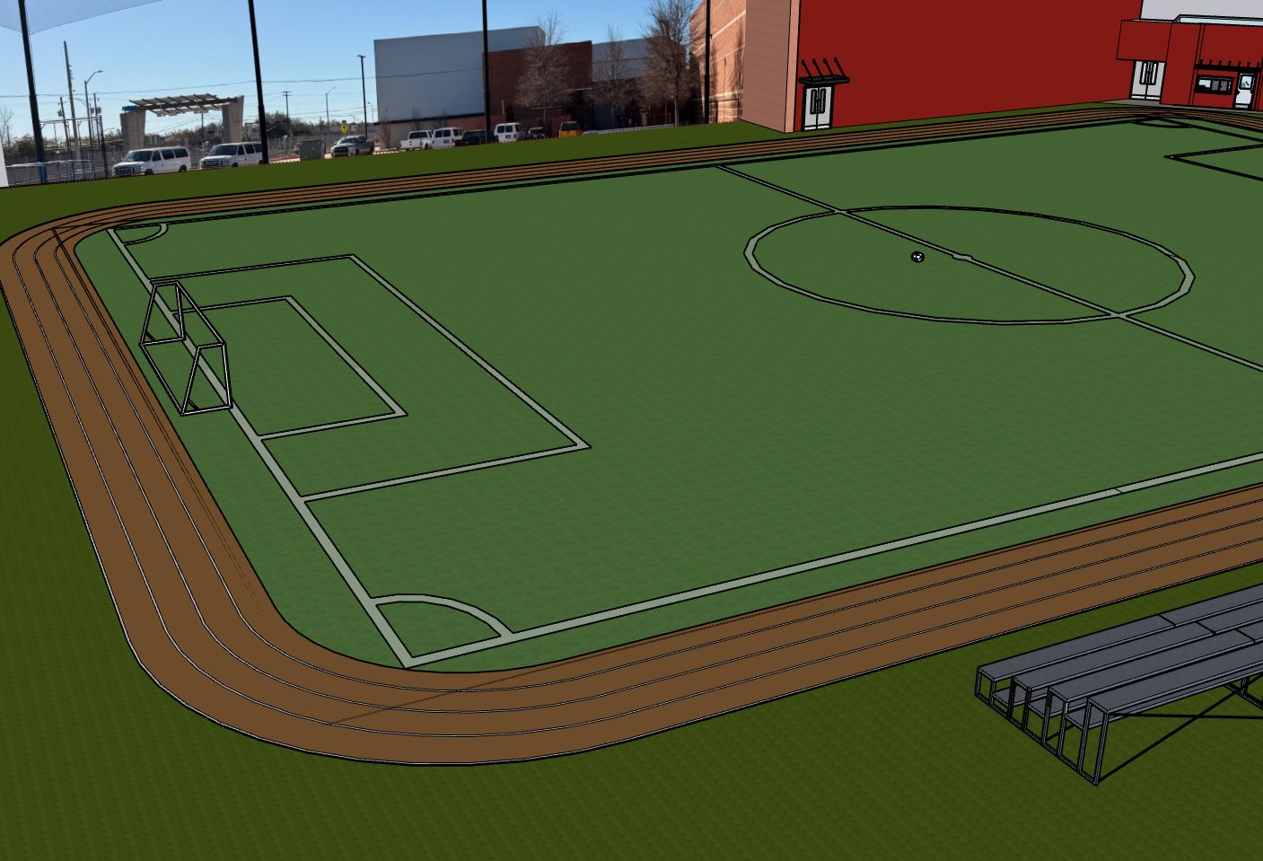 soccer field needs to be turf the outside of the track needs to be nicely cut grass make the sun at the noon position this view is facing south