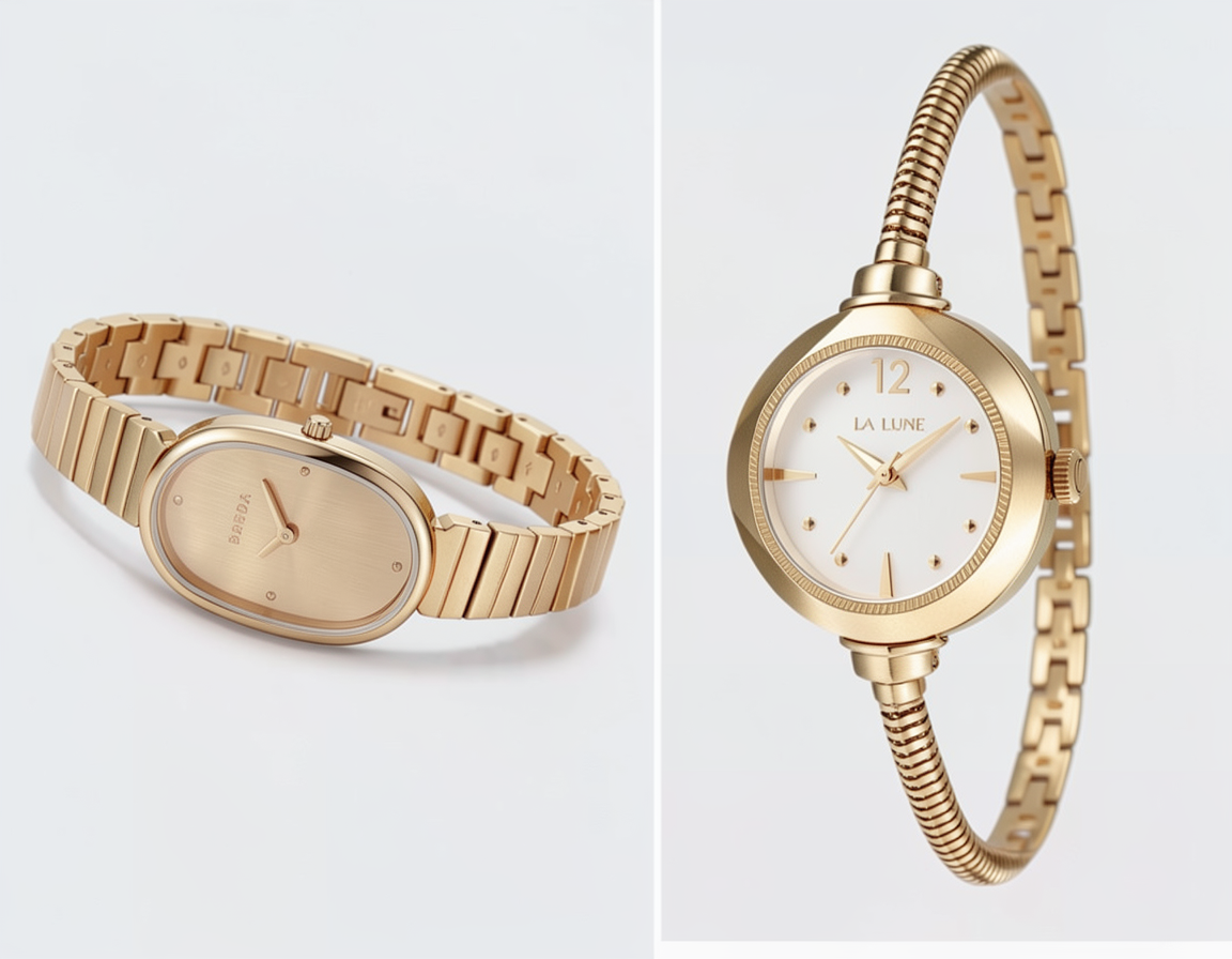 match metal finish from left side watch to right side keep design exactly the same add a very slight shadow below the right side watch