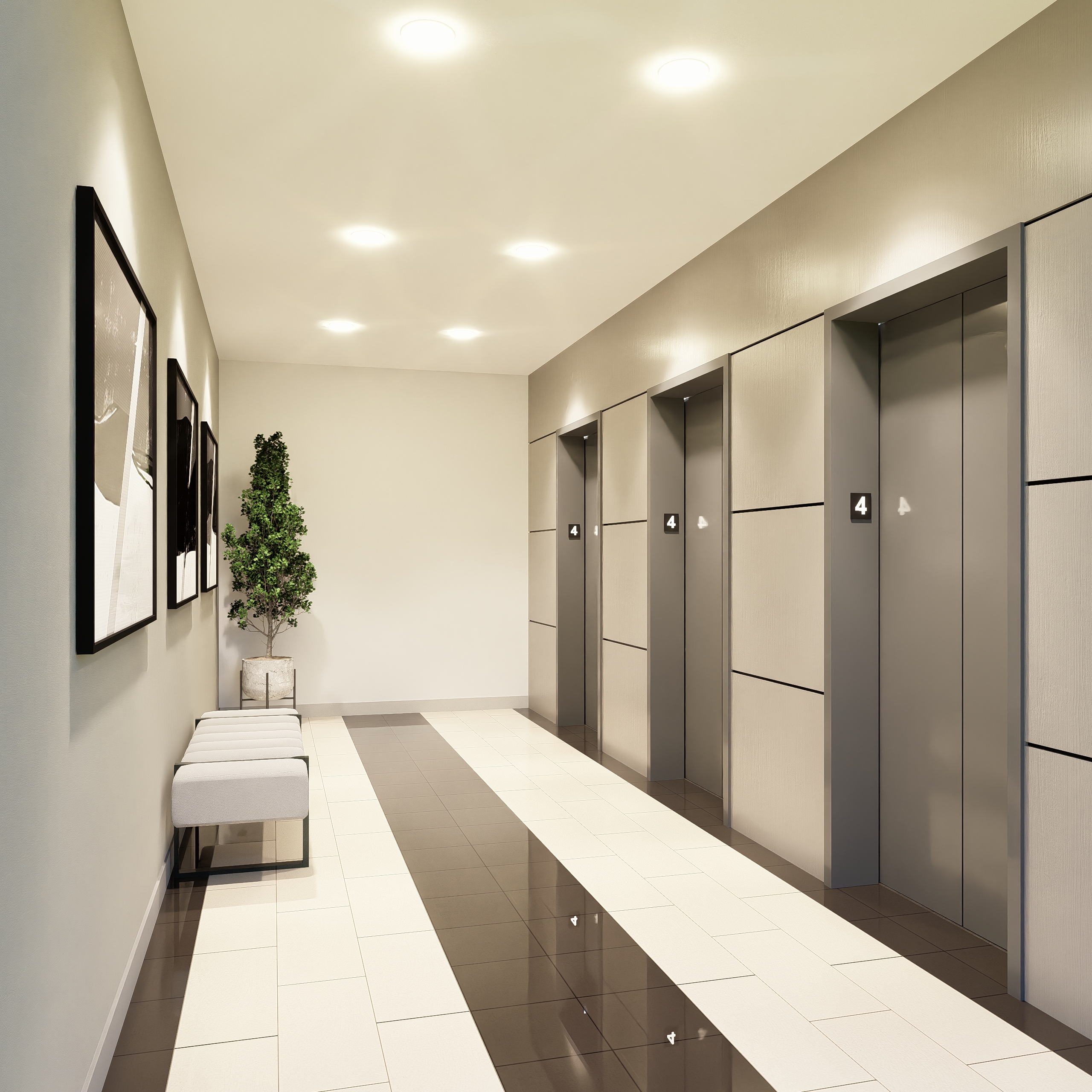 a high quality architectural interior render of the elevator hallway provided in the image with a specific modification replace the current grey wall panels around the elevators with large format porcelain slabs in pacific blanco style white with very subtle elegant light grey veining the slabs are 59 inches wide and 118 inches high installed vertically there is a clean horizontal grout line joint that is perfectly aligned with the top edge of the elevator door frames keep all other elements identical the three black framed abstract art pieces on the left beige wall the modern white bench the tall potted plant the shiny floor with white and dark brown stripes and the recessed circular ceiling lights realistic lighting and reflections thought el usuario quiere modificar una imagen existente como soy una ia de generaci n de im genes recrear la escena manteniendo la mayor fidelidad posible a la original pero aplicando los cambios espec ficos solicitados n1 cambiar la textura de la pared de los elevadores a pacific blanco m rmol blanco sutil n2 formato grande 59 x 118 n3 orientaci n vertical n4 la junta horizontal debe estar alineada con la parte superior del marco de la puerta del elevador n5 mantener el resto de la escena cuadros banca planta piso y luces igual est ees el link del material https horizontile com product pacific