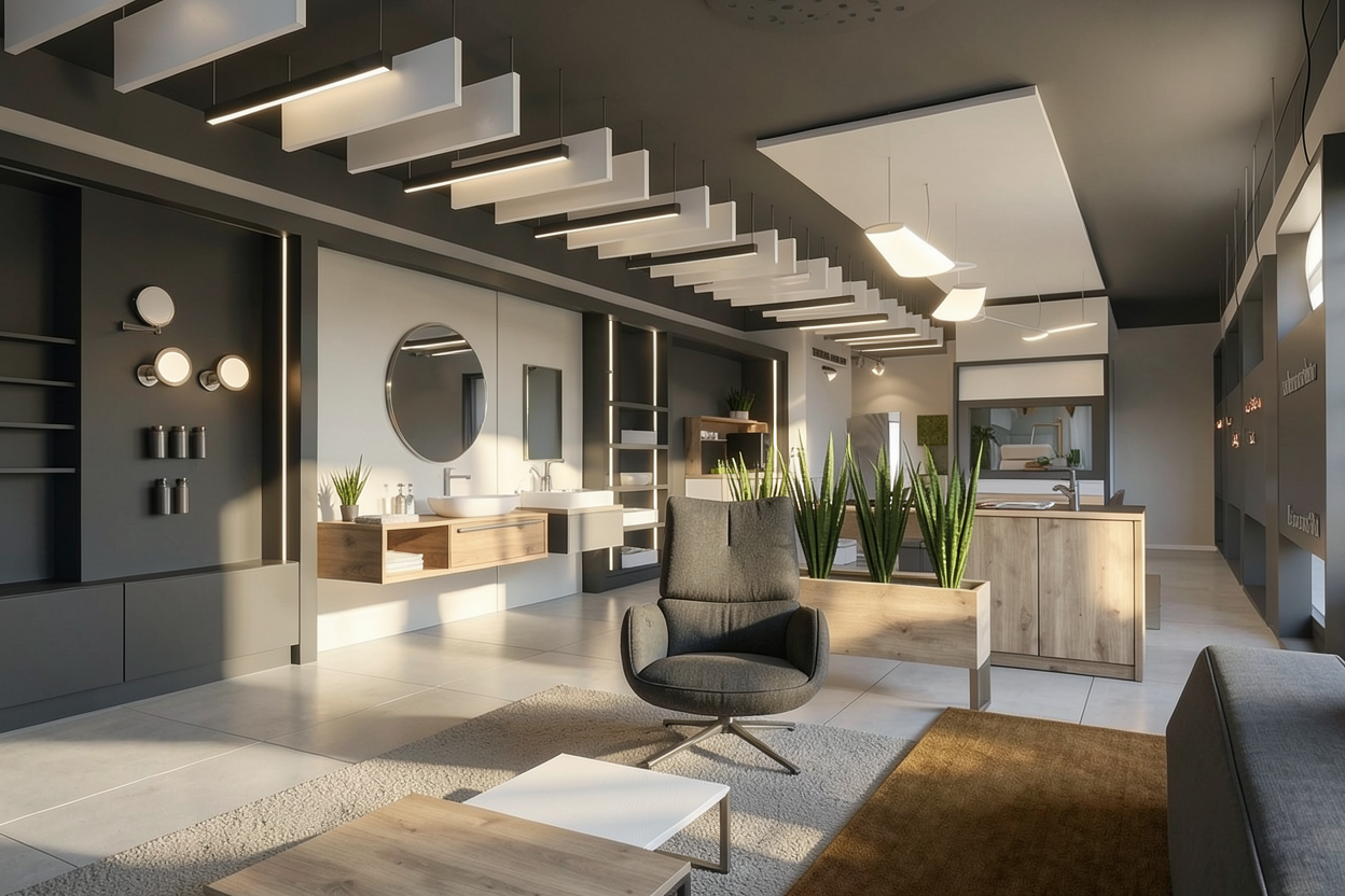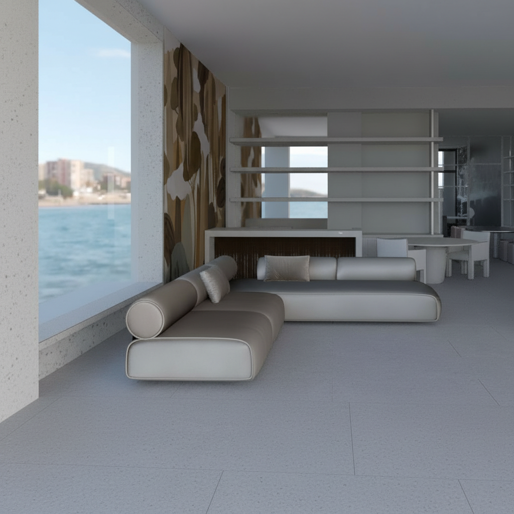 use the provided cad perspective strictly as the sole geometric and compositional reference preserve all elements exactly as given including proportions layout camera position field of view and object placement do not add remove reinterpret or redesign any architectural or interior elements no new objects furniture or light sources may be introduced under any circumstances all visible text within the image must be preserved exactly as shown do not alter reinterpret stylize translate or replace any text typography spelling layout and positioning must remain 100 identical to the original enhance the image exclusively through photorealistic rendering quality apply realistic materiality to all surfaces based on their implied function and construction maintaining the original design intent surfaces should exhibit subtle physical properties such as texture depth light absorption soft reflections and where appropriate controlled specular highlights or mirror effects avoid exaggerated or stylized materials aim for believable natural realism lighting introduce natural daylight entering the space in a plausible and context appropriate way the daylight should appear realistic and balanced without being limited to overcast conditions detect and utilize all light fixtures that are present in the original cad image these must visibly emit light and contribute to the overall illumination of the scene artificial lighting should produce realistic light falloff gentle highlights and nuanced shadow transitions do not add or invent any additional light sources beyond those already visible in the image the final image should read as a faithful photorealistic translation of the original cad perspective not as a reinterpretation the brown element in the right front is a sofa not a carpet