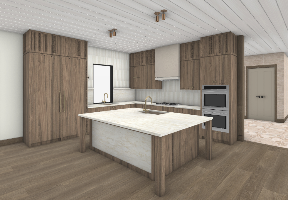 render a photorealistic 3d perspective of this kitchen in muskoka ontario reference the current material style just enhance them medium oak wood floors and trims medium oak wood reveal baseboards vertical backsplash tiles light beige color satin brass faucet and cabinet handles light beige plaster hood fan with a reveal and stone trim below it white wood ceiling finish keep model geometry the same windows doors cabinets walls wall tiles kitchen island ceiling light stone backsplash stone shelf hoodfan add a lake view to kitchen windows native to muskoka ontario add a few neutral accessories yo kitchen island and kitchen counter do not change the view only enhance the current materials and make the lighting more natural detailed textures atmospheric depth render in hyper realistic architectural visualization quality 8k resolution