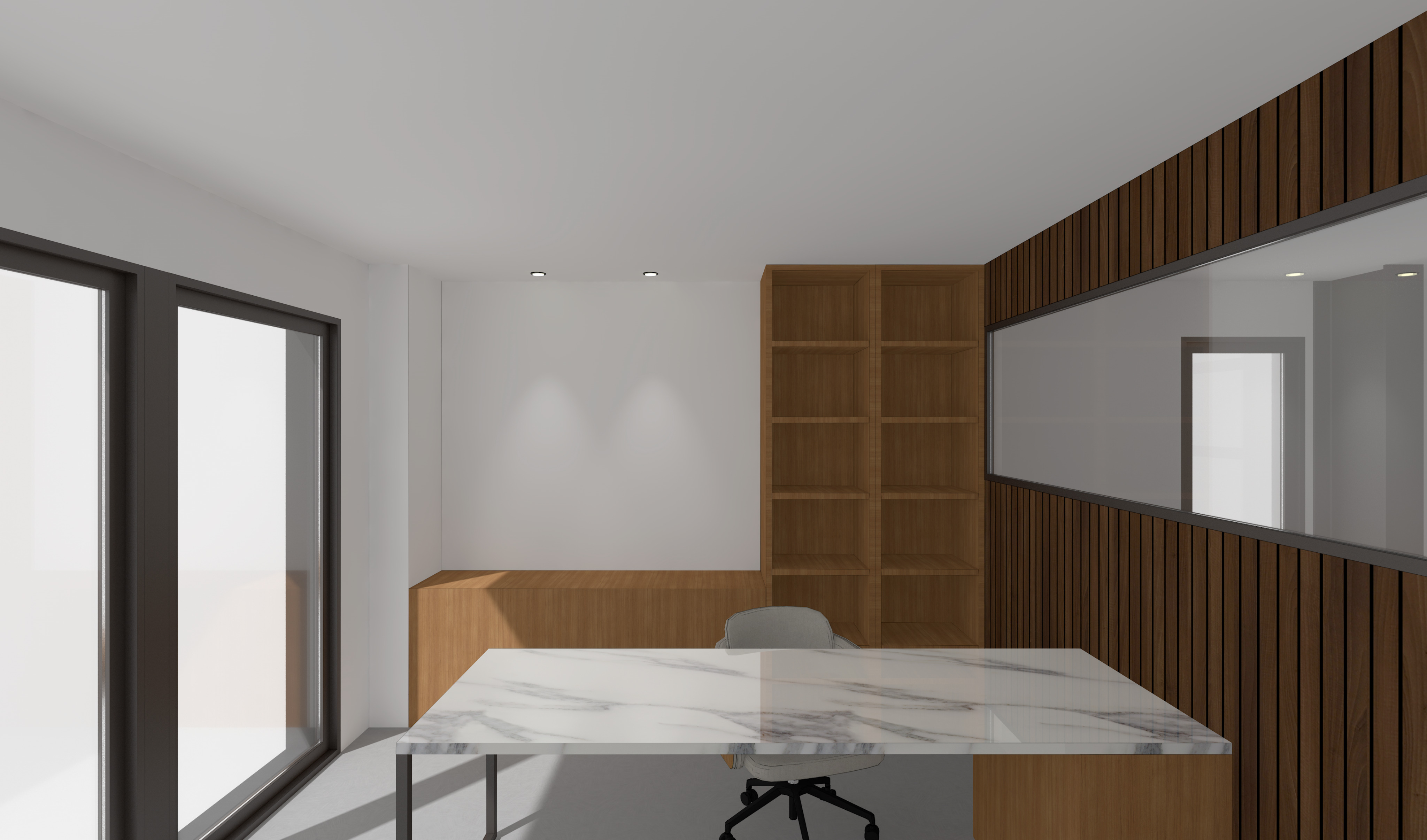 realistic render respecting colors on the left and the right they are windows add a abstract iage in a frame on the back wall add some office items