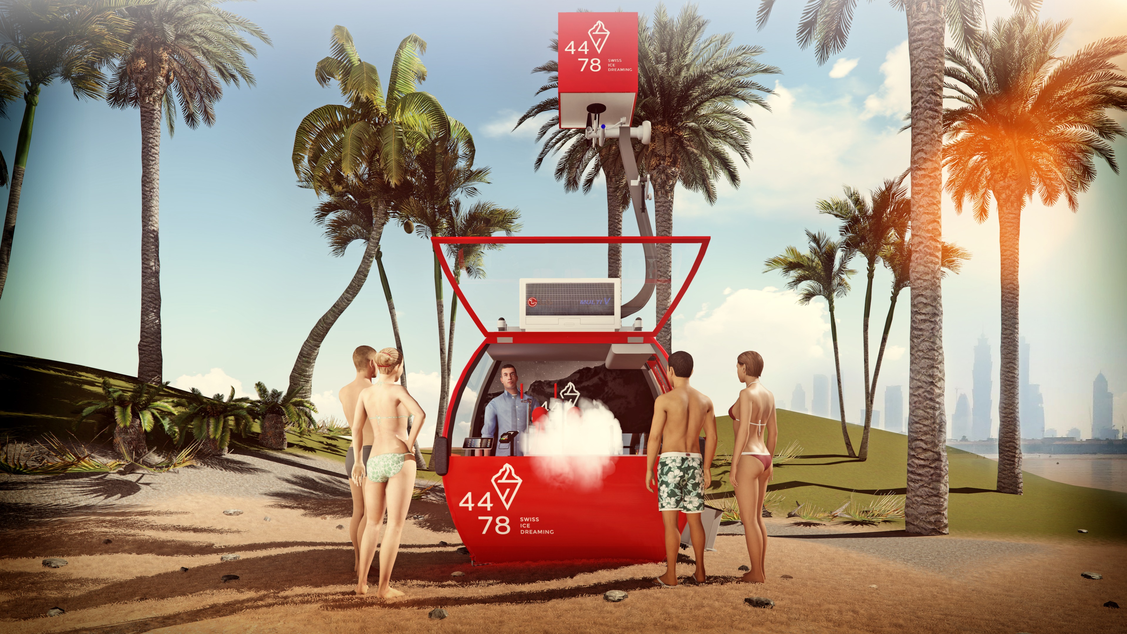 important preserve the existing geometry and the existing context exactly as provided preserve the existing windows do not add new windows do not modify alter reinterpret add remove scale or reshape any geometry do not change the site surroundings street layout neighboring buildings vegetation or context elements do not modify geometry scale proportions buildings road layout sidewalks or surrounding context in any way do not modify text soft beach atmosphere at sunset diffused neutral natural daylight with subtle cold tones cinematic architectural mood subtle environmental reflections of sky and surroundings do not modify the text remove the people remove the car do not add fog important do not remove the gondola make the sunlight more bright important do not modify the text do not modify the logo do not remove the steam from the gondola