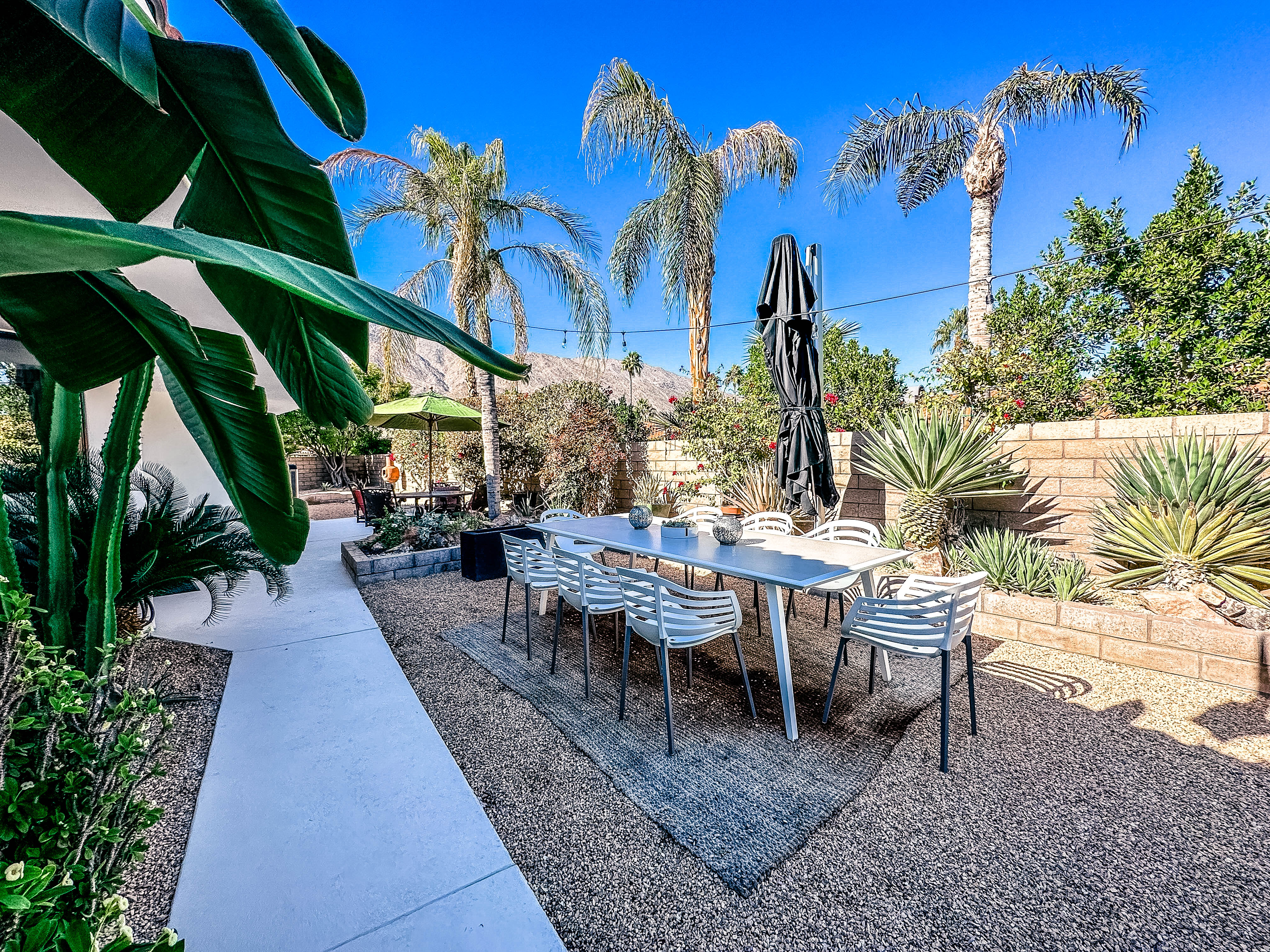 keep dark rug under the table but clean up gravel under the table and open the umbrella