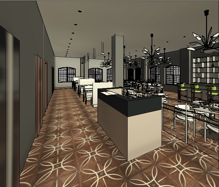art deco interior shot create a hyperrealistic rendering of a high end restaurant interior using the provided 3d model maintain the exact camera angle proportions and layout overall vibe upscale immersive and refined hospitality space inspired by organic luxury design the atmosphere should feel warm elegant and layered using deep greens rich wood tones bronze accents and soft neutrals lighting should be balanced warm not overly yellow with a slightly cinematic mood flooring keep the existing patterned wood flooring enhance with rich walnut tone base light geometric inlay pattern slight gloss finish for subtle reflections hostess stand foreground clad in deep green marble with strong natural veining polished base in warm wood clean modern edges make it a focal point with subtle light reflections seating layout booth seating primary straight booth seating arranged 2x2 along the glass railing no curves clean structured modern lines upholstered in deep green velvet with vertical channeling tables between booths square or rectangular wood or stone tops additional seating open dining area located behind the glass railing sculptural dining chairs with exposed wood frames upholstered in neutral patterned fabric soft beige earthy tones arranged in small balanced groupings maintain clear circulation paths bar area mood board inspired back bar with illuminated shelving fully styled with bottles of alcohol variety of glass tones and heights warm backlighting behind shelves materials dark wood bronze framing glass railing clear glass with minimal bronze or black metal supports subtle reflections for realism ceiling design key feature dramatic sculptural ceiling installation flowing layered wood or bronze slats in organic wave forms integrated led strip lighting within ceiling elements statement lighting linear cascading chandelier over main area additional sculptural fixtures with soft warm glow ceiling should feel dynamic and luxurious materials textures green marble host stand accents walnut dark wood floor furniture velvet deep green booths patterned neutral fabrics chairs bronze brass metal accents soft plaster or stone wall finishes lighting warm neutral lighting 3000k slightly desaturated to reduce yellow tone combination of decorative chandeliers recessed lighting integrated led strips in ceiling add soft natural daylight from windows realistic shadows and reflections on marble glass and wood decor styling add tablecloths on selected tables full table settings plates glassware cutlery napkins elegant minimal centerpieces bar shelves filled with bottles and glassware keep styling refined and not cluttered final look hyperrealistic high end restaurant with a strong material palette clean linear booth layout along the glass railing layered lighting and a dramatic sculptural ceiling as the main feature cinematic detailed and realistic architecture