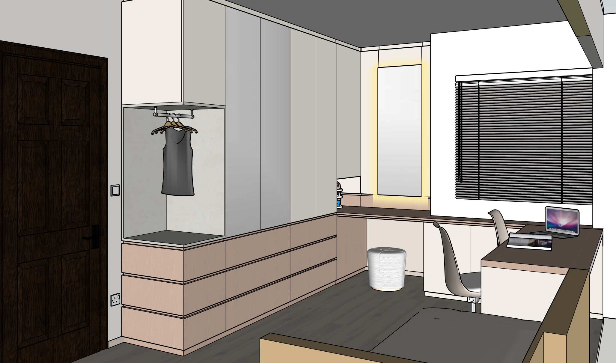 colours to remain accurate as per original given picture wood texture to be subtle 2 doors in the middle of the full height cabinet in mirror dresser top hung middle in mirror drawers and table surface in muted soft pink subtle wood grains niche in light beige microcement top half of carpentry in light beige 2 casement door below window in light beige ceilng in off white floor in muted light beige vinyl subtle grains