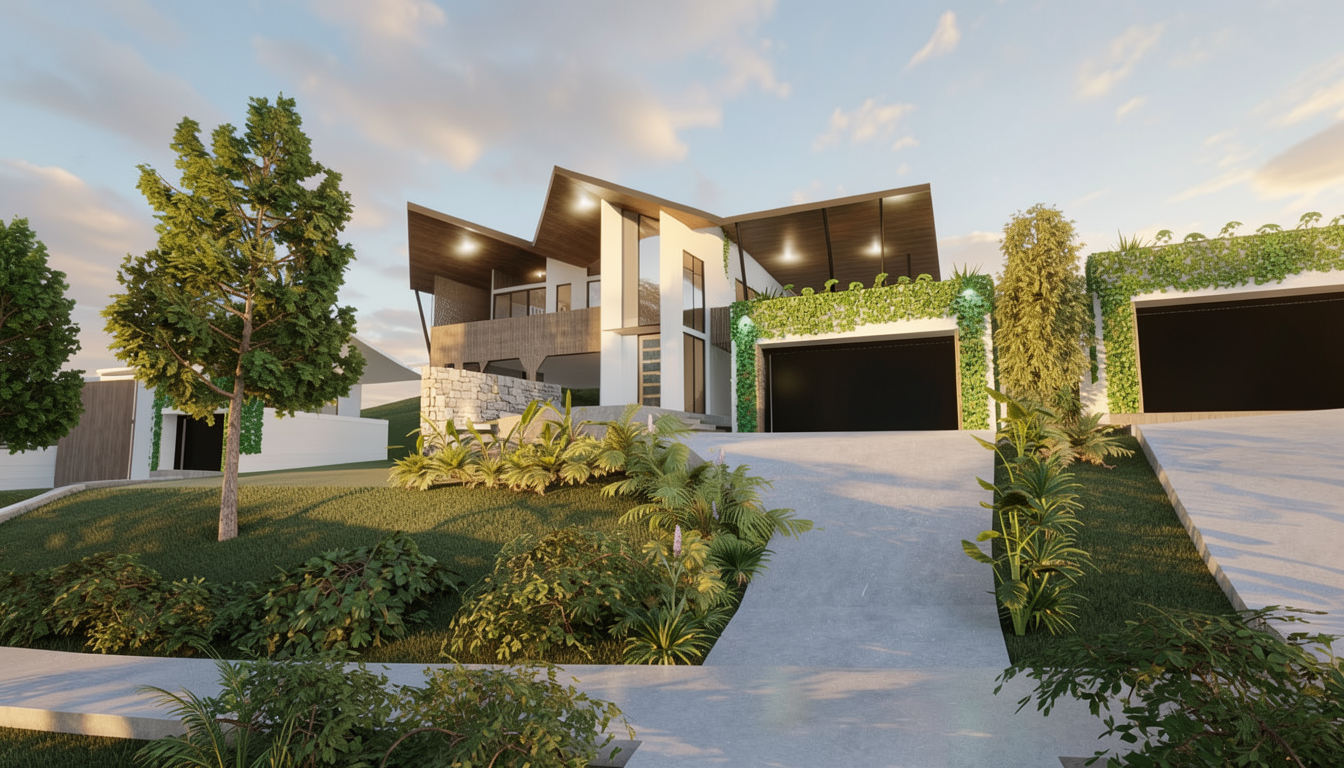 make photo realistic wth realistic textures extra lush planting and golden hour sky