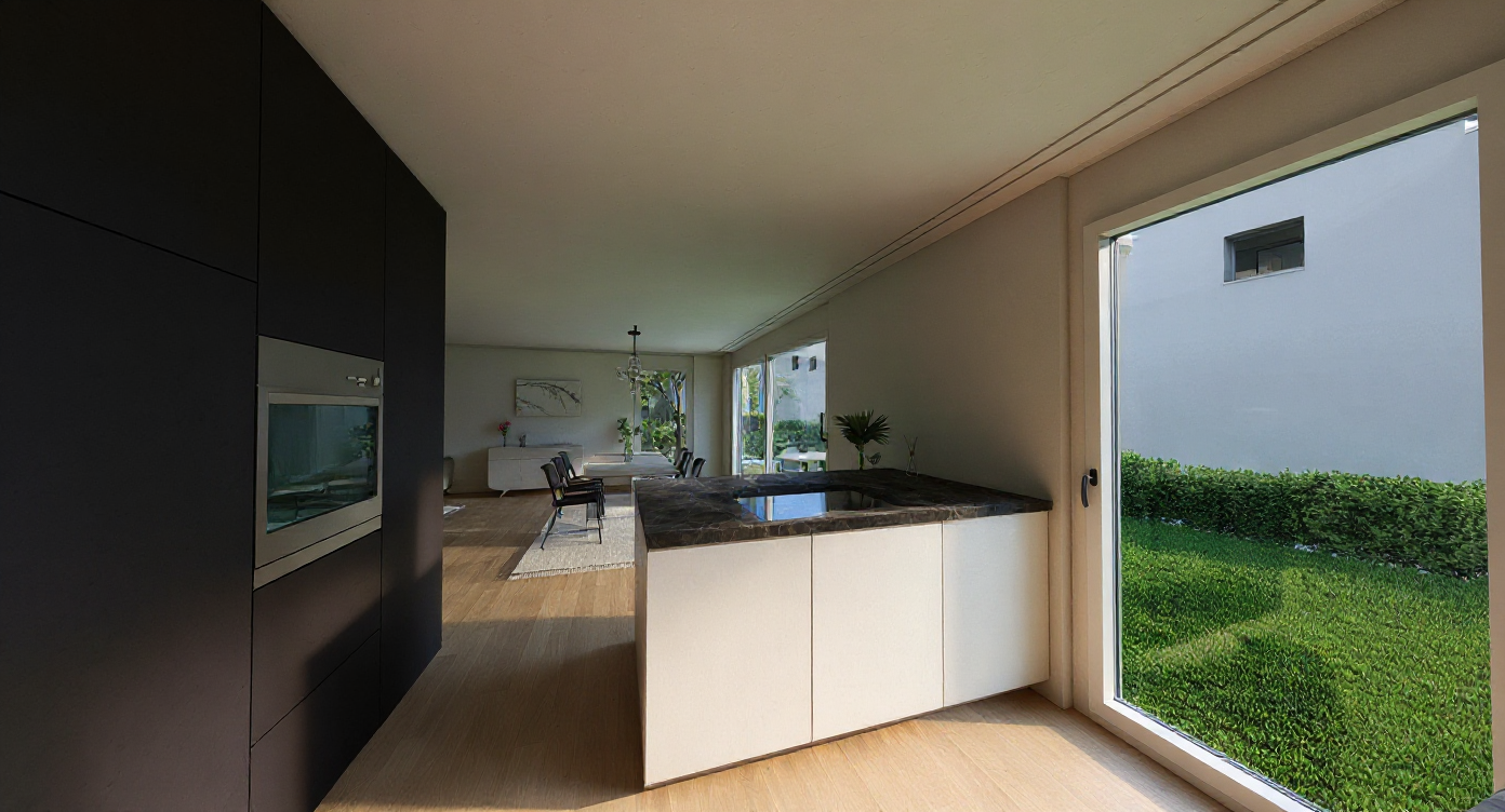 render image keeping all colors and finishes and architecture the same make photo realistic make ceiling 2x4 office grid with lights do not change architecture keep stools light green