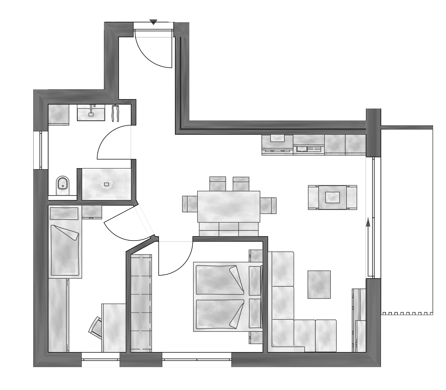 erstelle ein fotorealistisches top down grundriss rendering basierend auf der beigef gten 2d architekturzeichnung mit folgenden anforderungen die exakten raumabmessungen wandpositionen t r und fensterpositionen sowie erschlie ungswege m ssen genau wie im plan dargestellt bernommen werden die ausgabe muss eine echte orthografische draufsicht sein keine perspektivansichten keine innenraum augenh hen renderings keine axonometrischen oder schr gen ansichten das ergebnis soll aussehen wie eine real gebaute wohnung die direkt von oben fotografiert wurde mit realistischen materialien und licht nicht wie ein flacher vektorplan stil materialit t fotorealistische oberfl chen verwende einen zeitgem en warm minimalistischen einrichtungsstil dargestellt durch realistische von oben sichtbare oberfl chen farbpalette sanfte wei t ne warme graut ne nat rliches helles holz matte oberfl chen schwarze metallakzente bodenbel ge wohnr ume und badezimmer gro formatige matte feinsteinzeug in warmem grau schlafzimmer landhausdiele eiche w nde glatt verputzt und in off white gestrichen sichtbar ber wandst rke und farbton von oben decken nicht sichtbar au er bei einem schnittdarstellungsstil keine abgeh ngten leuchten oder h ngelampen darstellen raumspezifische details in draufsicht alle r ume sollen ausschlie lich in draufsicht m bliert werden mit realistischer gr e und anordnung eingang minimalistische konsole oder stauraum wohnzimmer niedriges sofa couchtisch teppich dezente dekoration essbereich schlichter esstisch mit sitzbank und st hlen an die wegef hrung angepasst k che grifflose fronten in hellem holz und mattem taupe arbeitsplatte aus warmwei em quarz integrierte ger te k cheninsel falls im plan vorhanden schlafzimmer gepolstertes bett nachttische teppich einbauschrank b der schwebender waschtisch aus holz bodengleiche dusche mit klarer abtrennung laut plan wandh ngendes wc fenster licht fenster mit schlanken schwarzen rahmen sanftes nat rliches tageslicht das entsprechend der fensterposition auf die b den f llt keine dramatischen schlagschatten durch kamerawinkel das licht soll wie gleichm iges nat rliches oberlicht wirken rendering anforderungen verwendung fotorealistischer pbr materialien realistische oberfl chenstrukturen dezente reflexionen und globale beleuchtung saubere aufger umte darstellung sichtbar von oben t r ffnungsrichtungen und vorhandene m bel aus dem originalplan beibehalten fehlende m bel logisch erg nzen mit korrekter ma st blichkeit und bewegungsfl chen ausgabe ein einzelnes hochaufl sendes 4k fotorealistisches top down grundriss rendering keine perspektivbilder keine innenraum ansichten auf augenh he keine schr gen oder axonometrischen darstellungen nur der grundriss dargestellt als w re er direkt von oben fotografiert