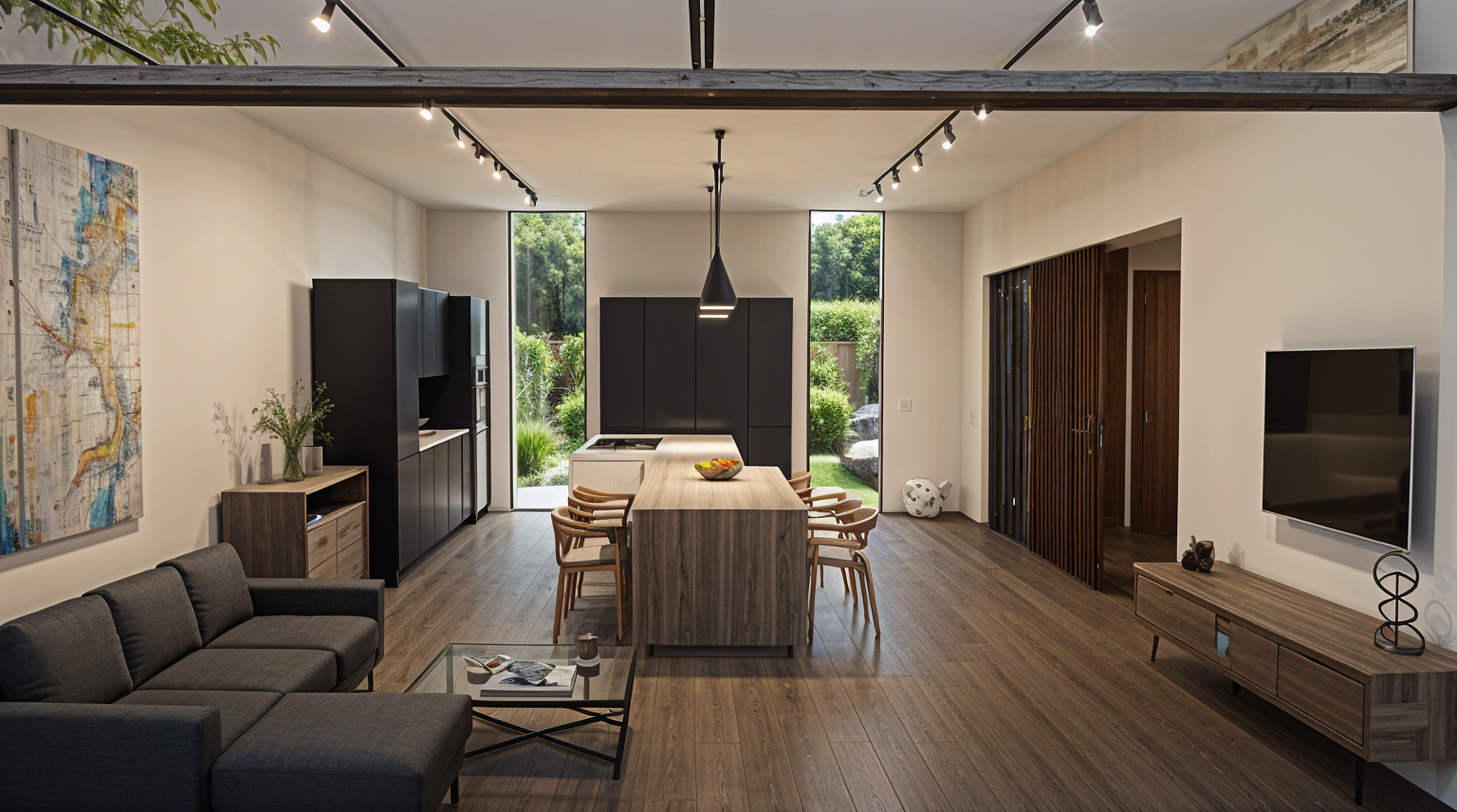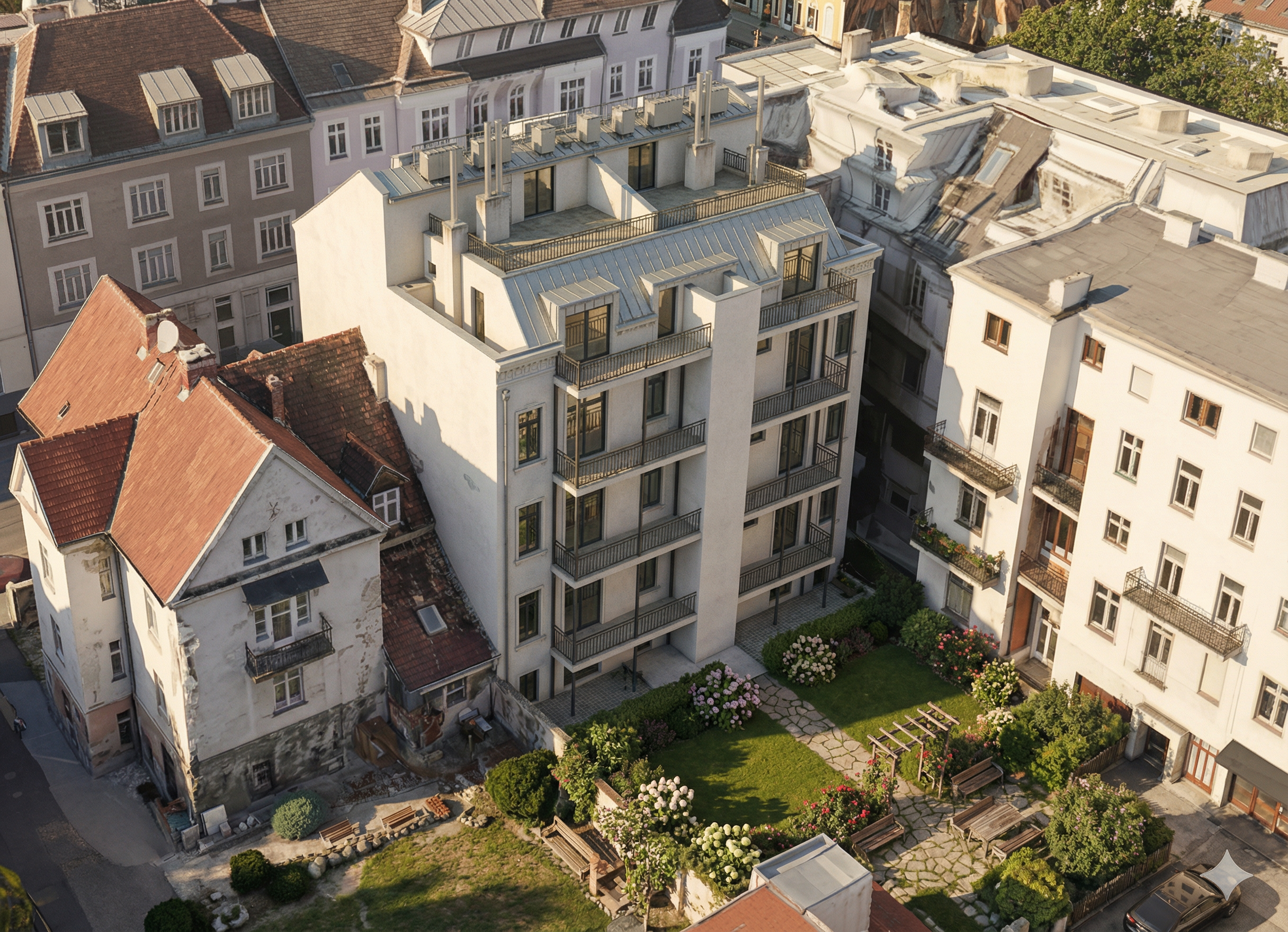 make the l shape volumes black metal cladding keep the brick in the middle also white stucco on left and right areas including above the garage door the landscape more simple remove the small bushes