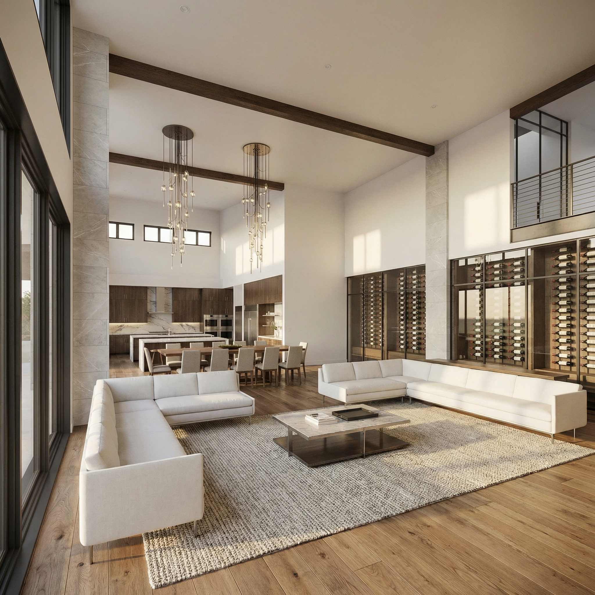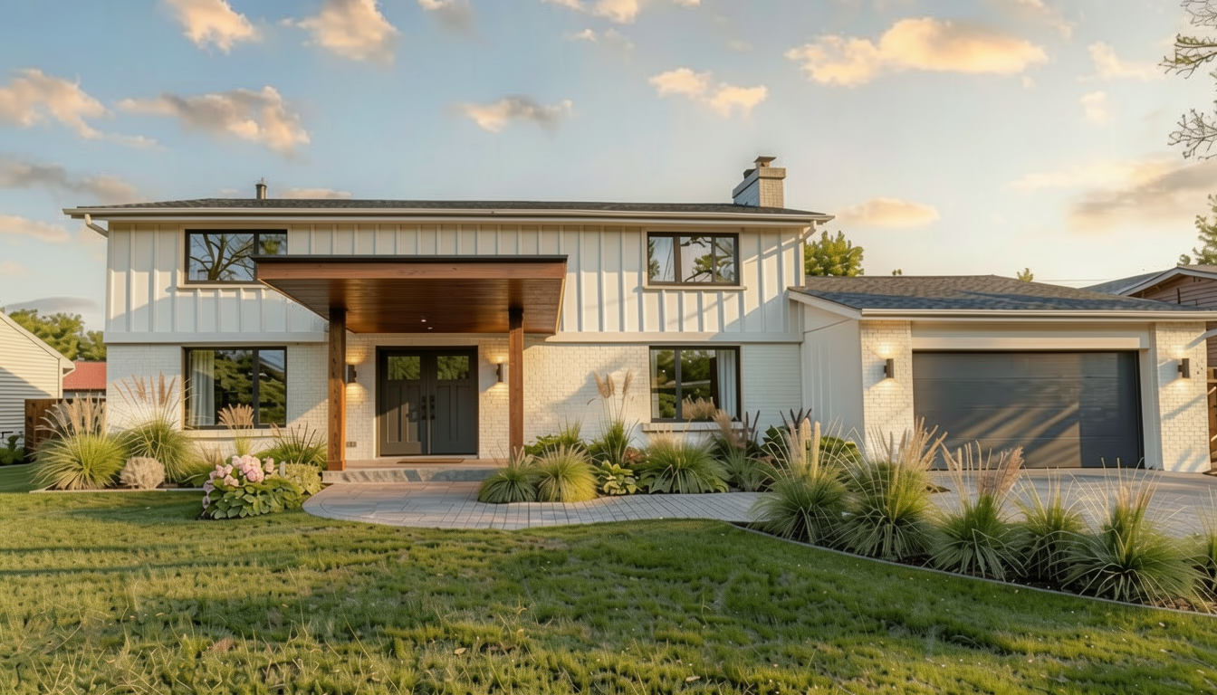 increase the size of the horizontal wood beam above the entry posts so it reads as a strong structural element the beam should be slightly taller and more defined make the canopy above the beam thinner and flatter with minimal pitch keep the wood posts thick and modern do not change the rest of the house create a shallow modern entry canopy with a projection of about 4 feet and a think horizontal roofline the canopy should be minimal and elegant with a slim fascia two simple wood support posts placed just outside the double front doors and a warm wood soffit ceiling keep the canopy visually light and proportional to the facade