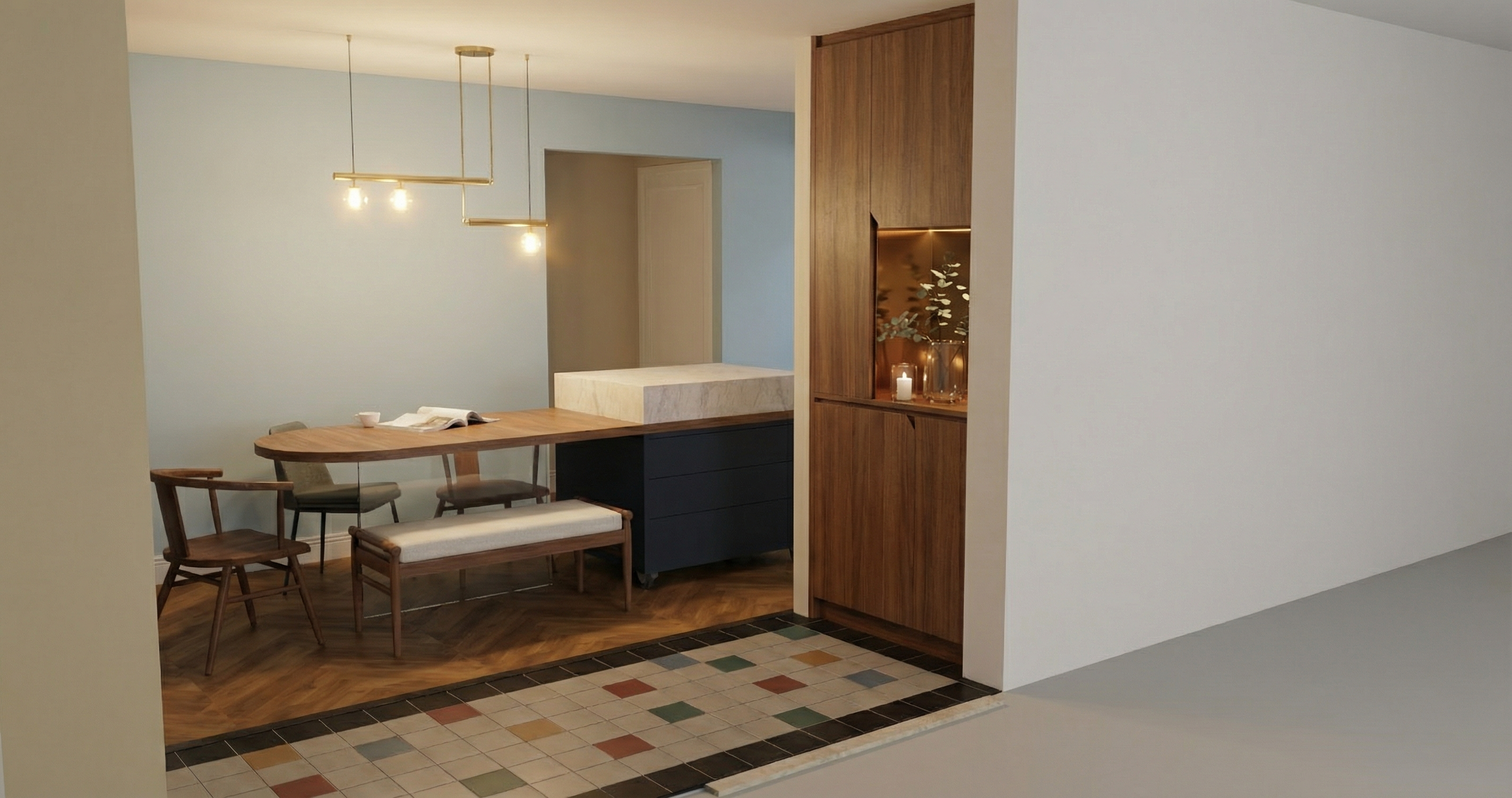 all cabinetry to be white shaker style pendant lights are these https lightingcollective com au products traditional ceramic pendant assorted size stone bench top to be https www caesarstone com au colours 4001 fresh concrete it is a creamy light tone hand soap near kitchen tap is https alivebody com au products kitchen trio lemon pomegranate variant 43810328314096 country au currency aud tp cid 22748875176 tp id 762054959221 tp pid shopify au 8213717549296 43810328314096 tp source google gad source 1 gad campaignid 22748875176 gbraid 0aaaaab01yxqhra7btn0qohrmvf8mq dro gclid eaiaiqobchmi3frx89lfkgmvtmjmah3j5xlzeayyasabegisyfd bwe splashback tile is https dilorenzo com au products zelij collection chalk gloss size to be 100x100mm square stacked please also include one skylight between the back cabinetry run and island bench to be centred between oven and sink timber finishes to be light oak bulkhead above full height cupboards feature tile to be square 10cm x 10cm stacked no nib wall on right side of fridge just a joinery end panel tiles to be 2x size