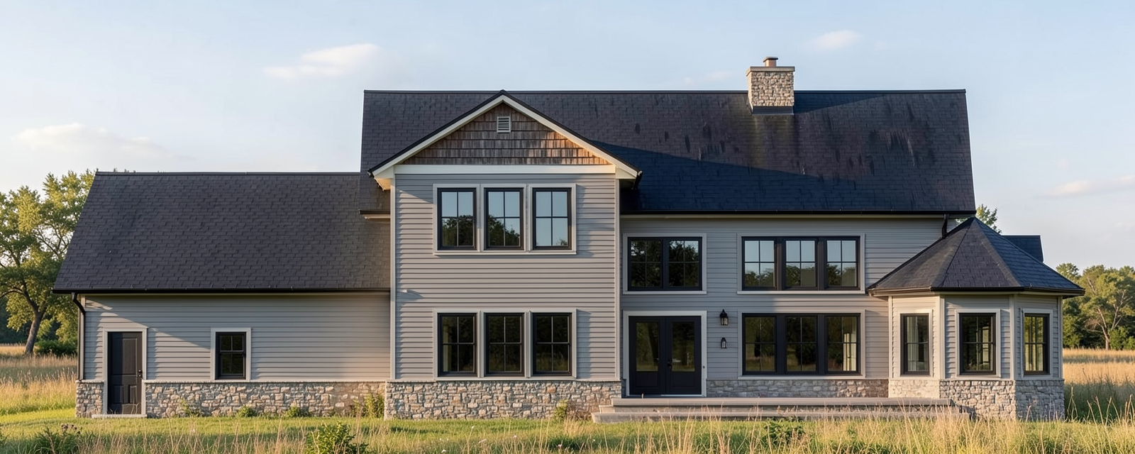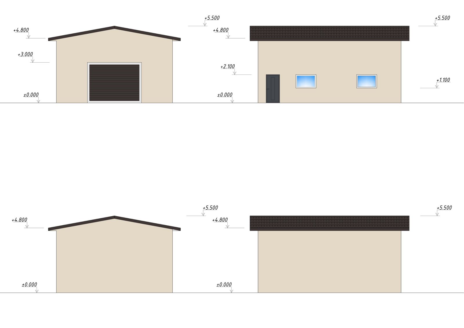 front and side architectural view of a modern warehouse building with a beige facade and a dark brown gable roof the garage door is a sleek dark brown complementing the roof include two small rectangular windows with clear blue glass casting a soft reflection the main door is a darker shade of brown seamlessly fitting into the design surround the building with a serene atmosphere a bright clear sky overhead use soft shadows to accentuate the building structure enhancing the overall modern look with a warm inviting ambiance