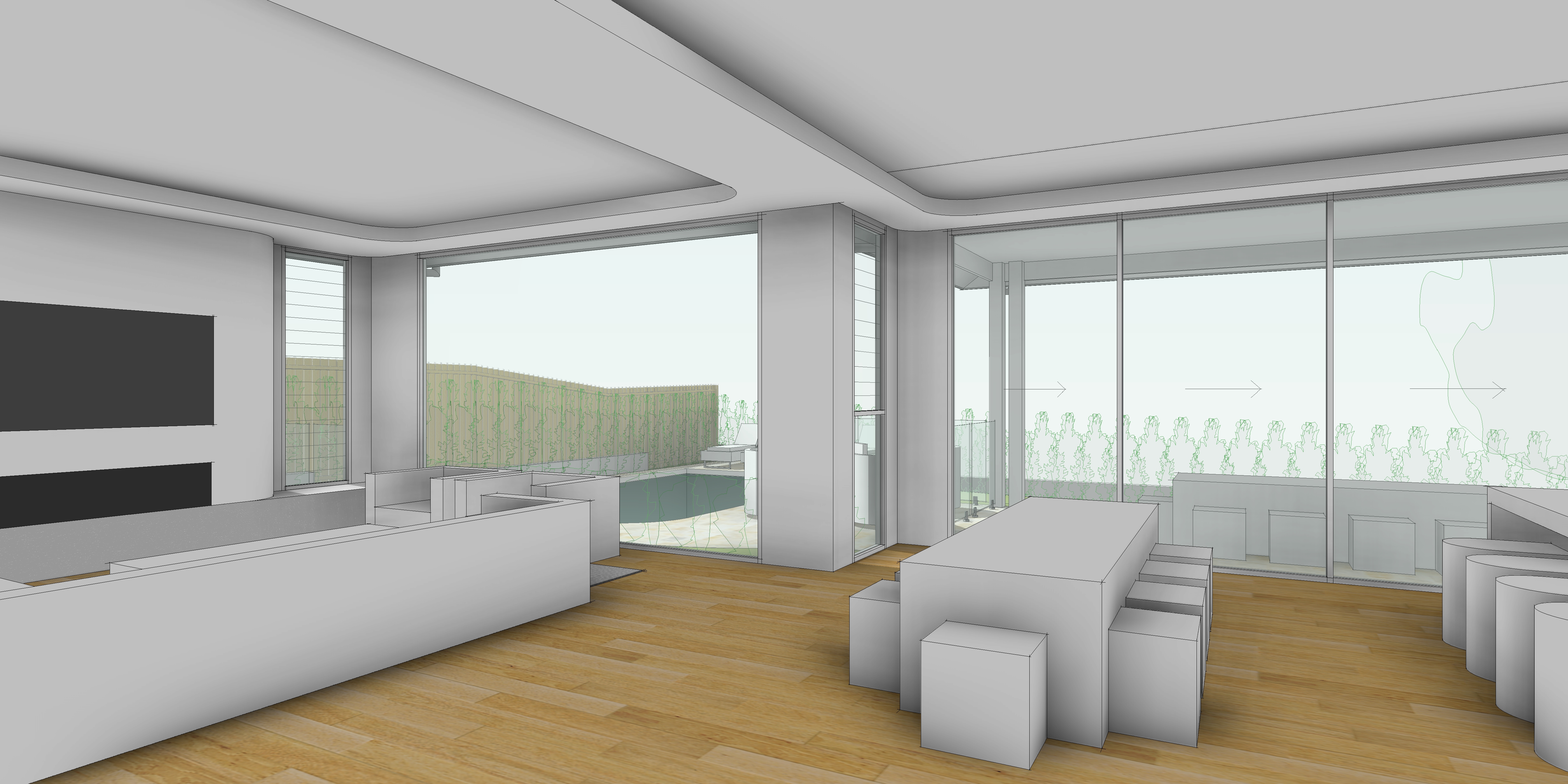 a modern luxurious living and dining area with a serene and sophisticated atmosphere the walls are clad in a soft cashmere hue with panelling complementing the cabinetry overhead lighting is warm and ambient creating a cozy yet refined ambiance the flooring is parquet enhancing the airy feel of the space sparse greenery adds a hint of freshness while maintaining the minimalistic and clean design outdoor light from the left hand side window view is of native australian backyard