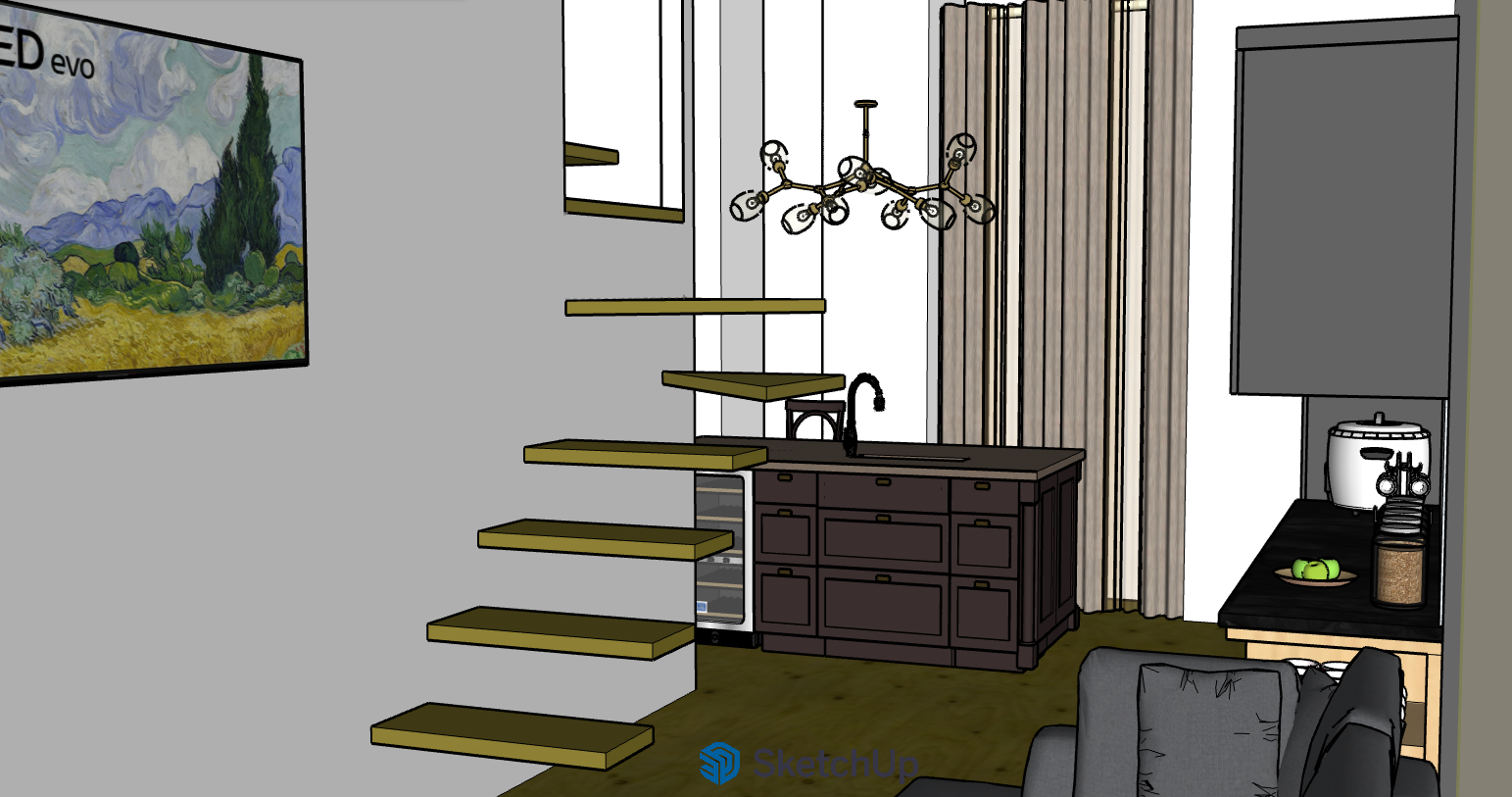 international style interior shot wooden floor white marble kitchen grey sofa architecture