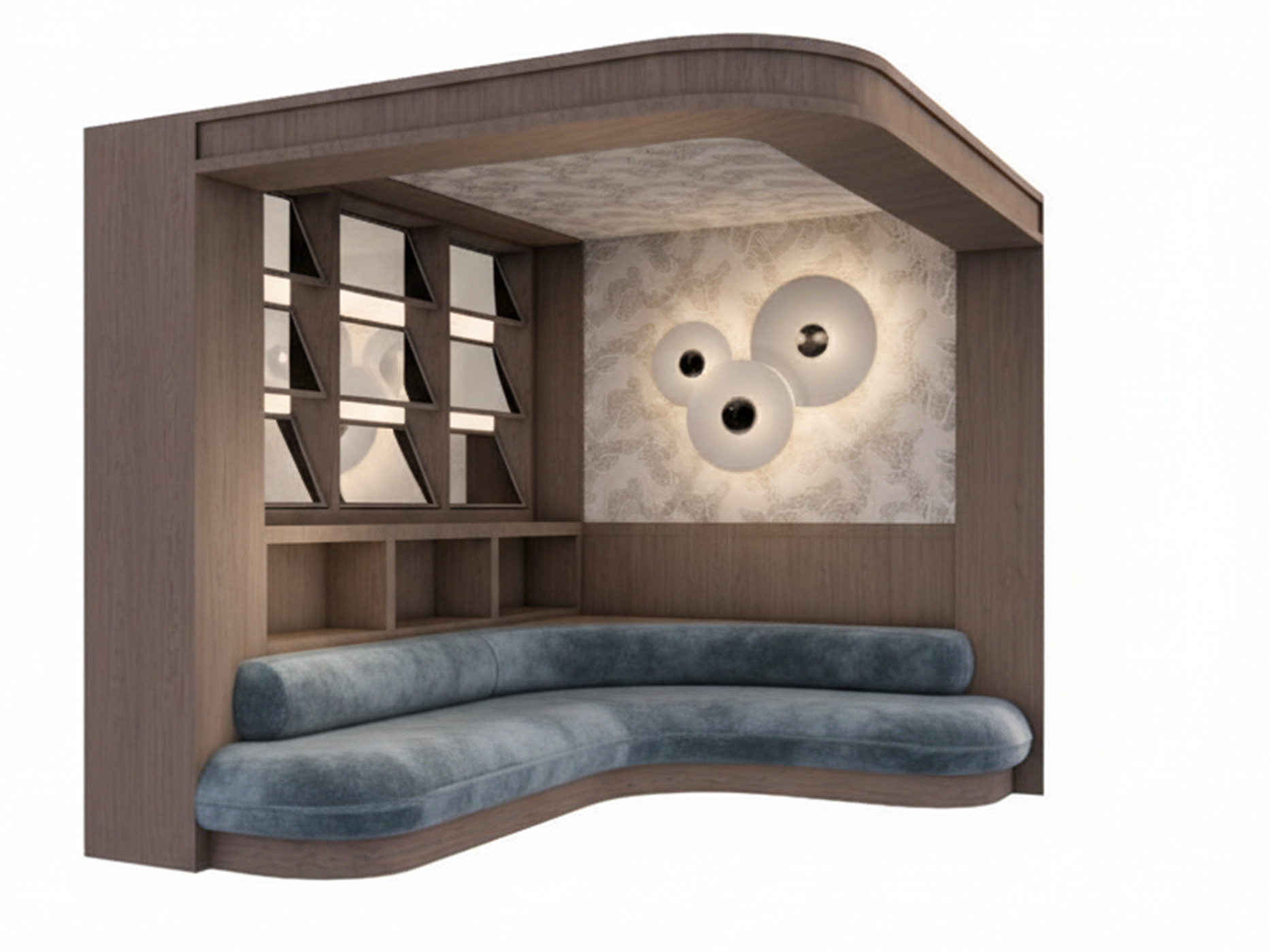 add books to bottom shelves above seating