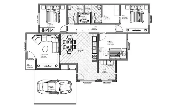 convert this floor plan into a realistic isometric 3d view of a full house show the space from an elevated angle with furniture walls and details visible render a modern architectural floor plan in a realistic style highlight the patio garden area with lush greenery in various shades of green and vibrant flowers in colors like red yellow and purple the pergola should be depicted in a natural wood tone use light gray for the driveway and a sleek metallic color for the car the kitchen area should have a contemporary look with white cabinetry and stainless steel appliances the dining area features a wooden table with chairs in a soft beige the living room should appear cozy with a plush gray sofa and cushions in shades of blue incorporate plenty of natural light to create a warm and inviting atmosphere use the same furniture as shows on the plan do not change the orientation of the floorplan