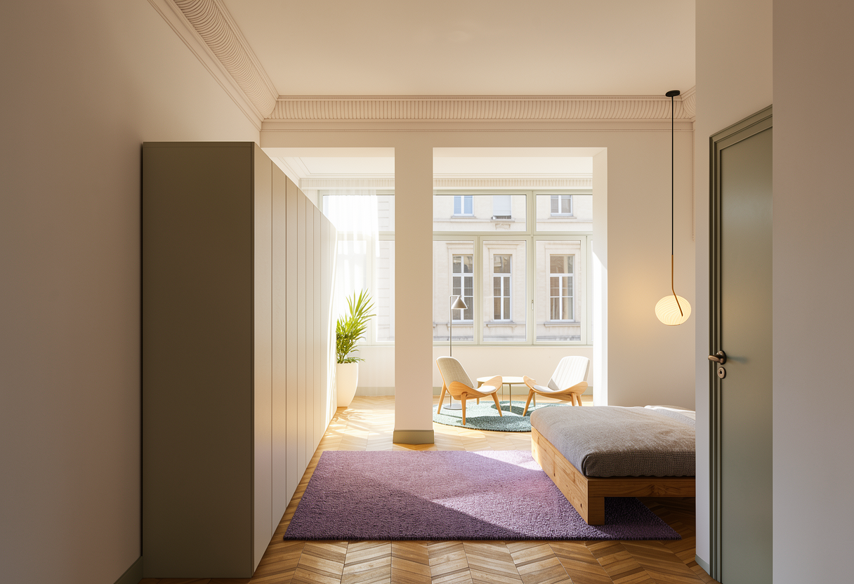 photorealistic interior top down view of floorplan with warm darker orange overlay color polished concrete floors white walls and light metal orange finishes the space is lit up with soft soft lights bright lighting and overall environment is soft bright lighting