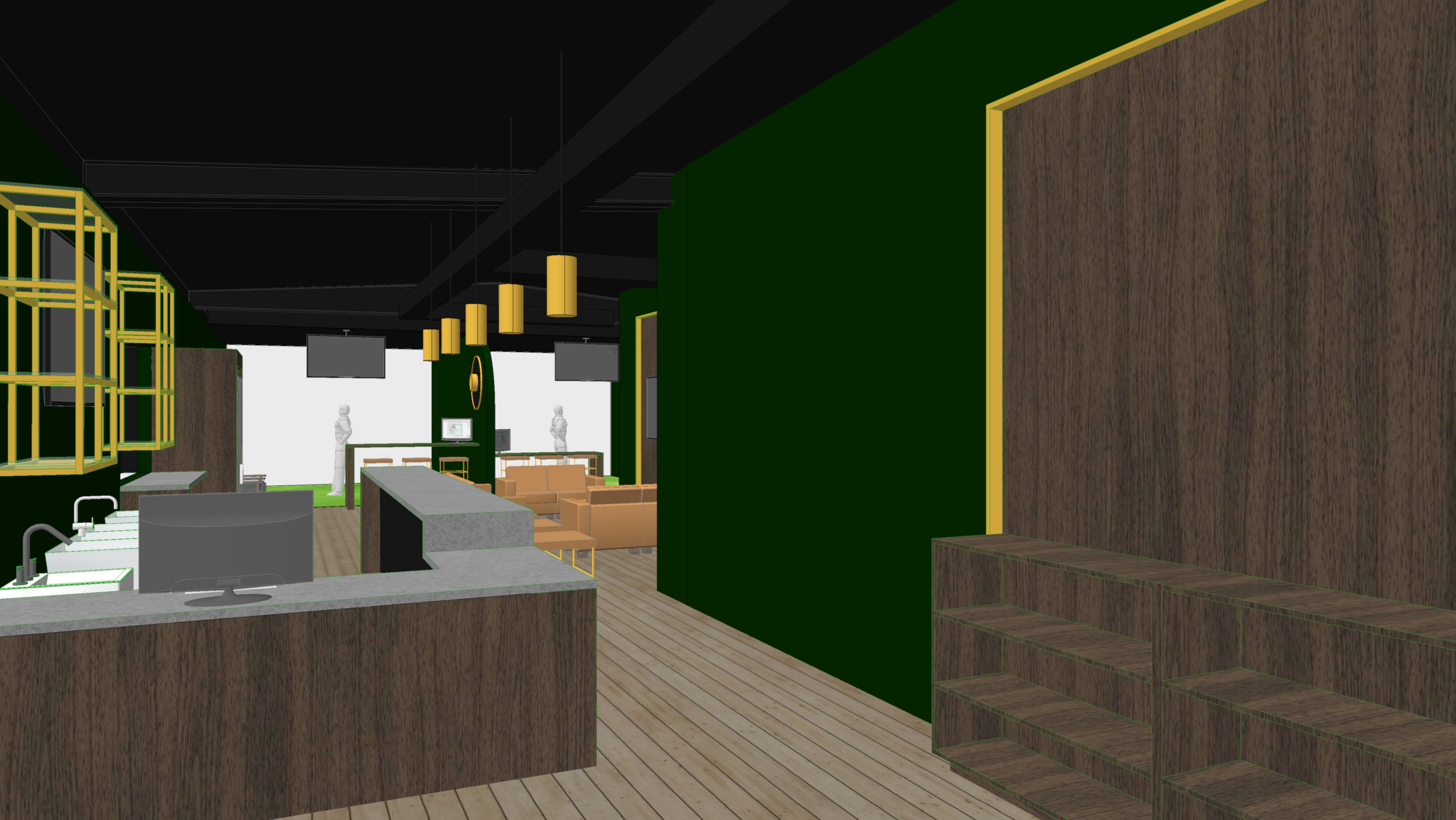 photorealistic interior view of a lounge maintaining colors and geometry with dark green walls and charcoal colors ceiling with glass and gold metal framed shelving with liquor bottles behind the bar on the left side of the imagers with a tv between the shelves with granite bar top with gold and gray flex and movement in the stone golf simulator screens in the background on the large white surfaces midcentury lighting fixtures and furnishings casual bar patrons in casual clothing fun vibe art on walls with augusta golf courses foreground cabinet and wall to have golf merchandize such as golf balls hats and golf shirts on hangers and open glass shelves with golf balls in packaging