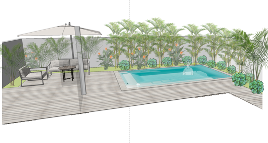 add person siting on chair and a man in the pool glass pool fence is on left running from the back wall to the front not around pool