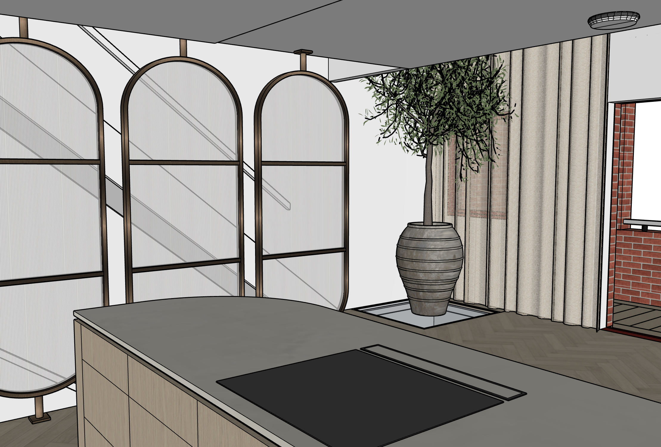 add photorealism while keeping your colors and materials unchanged add warm lighting creating a natural light filled home feel ensure stairs are seen through the reeded glass dividers