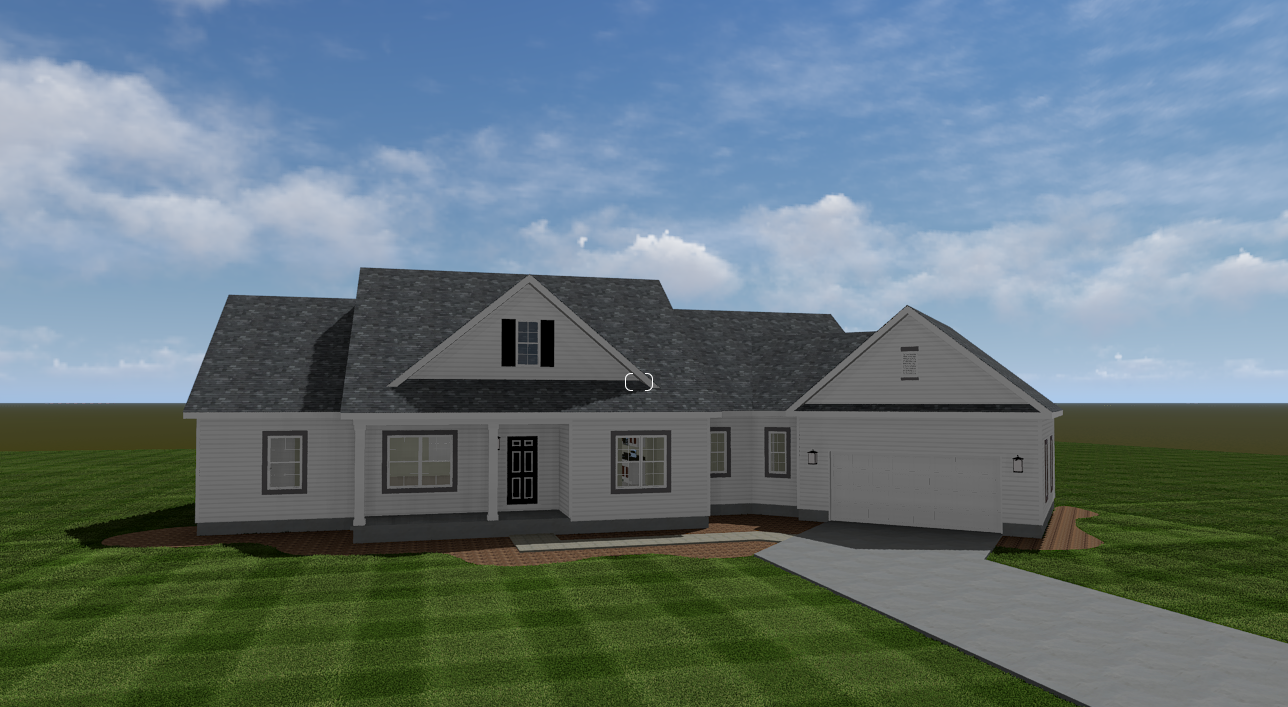 make as photorealistic as possible while keeping textures the same as selection professional landscaping in a lightly wooded scene with good lighting match materials to plan and remove any text light grey siding white trim windows black solid frontdoor