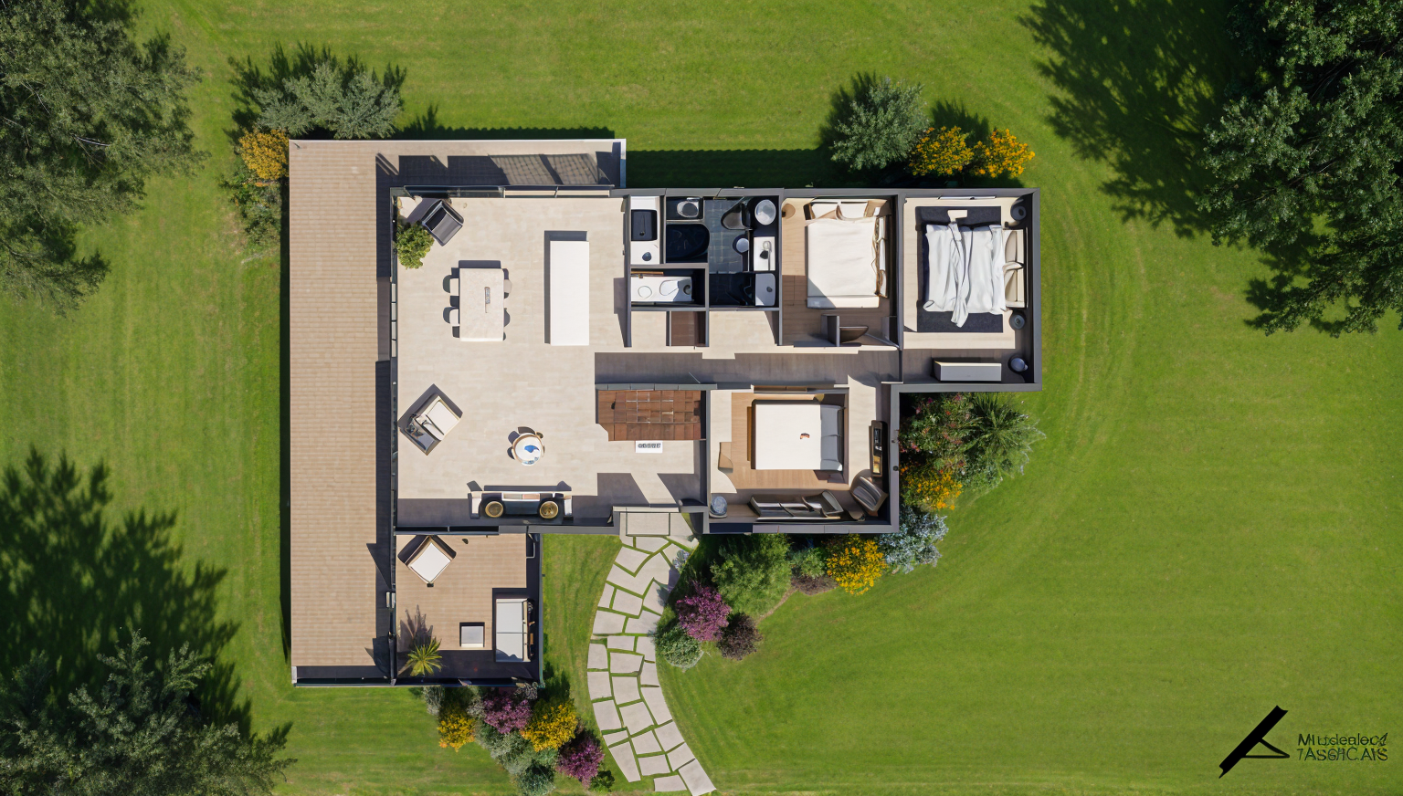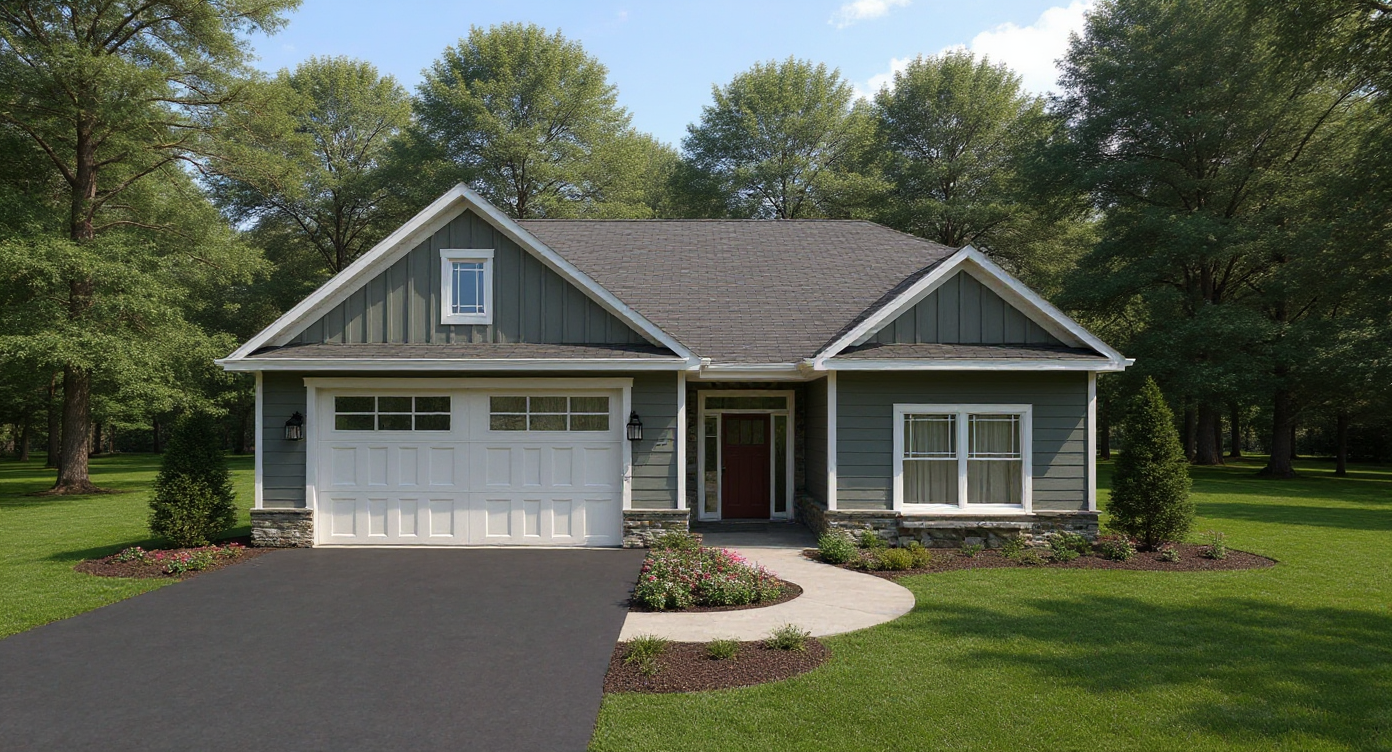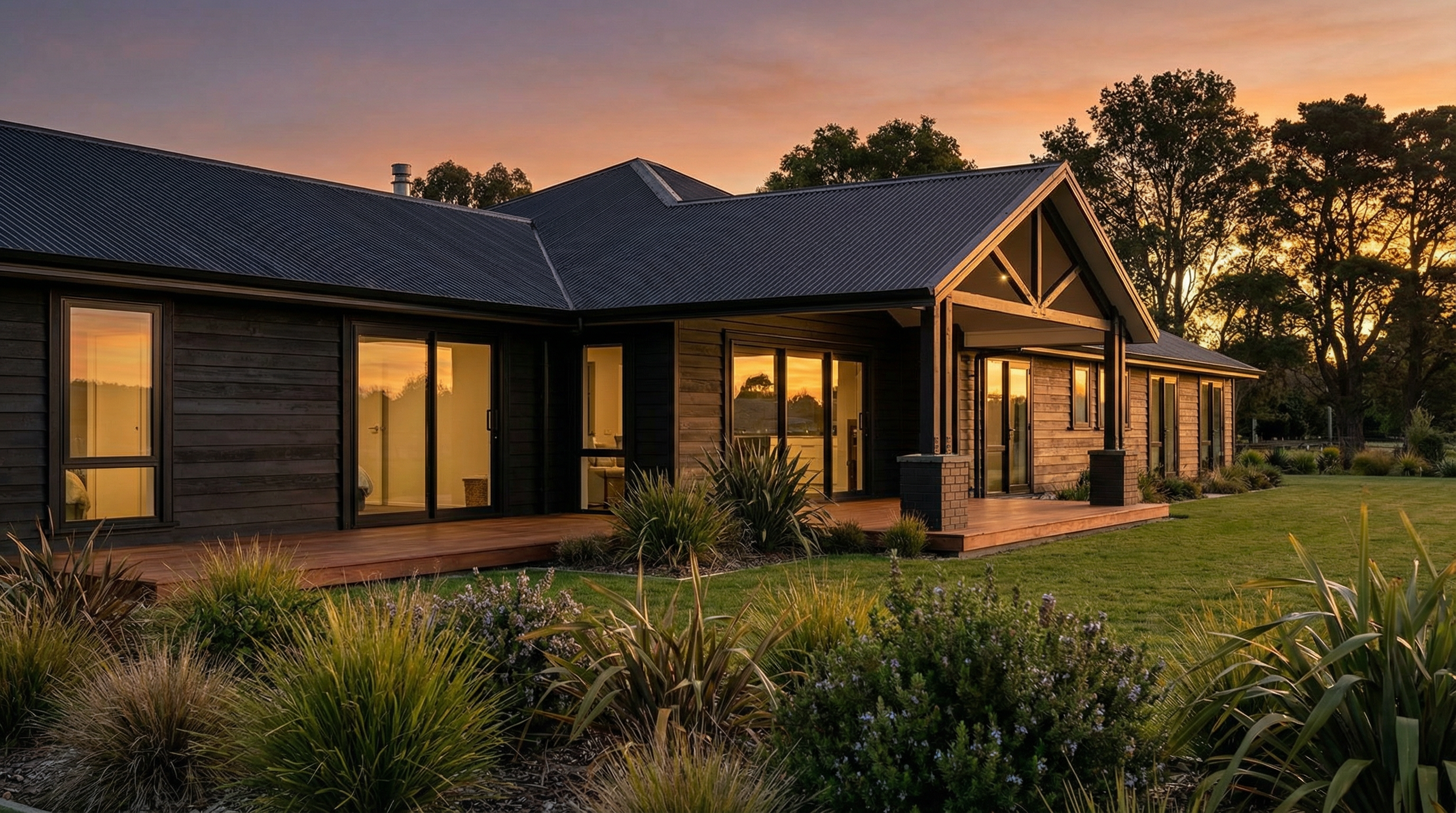 black weatherboard cladding black roof black window frames lawn low timber deck extensive native planting background trees sunset