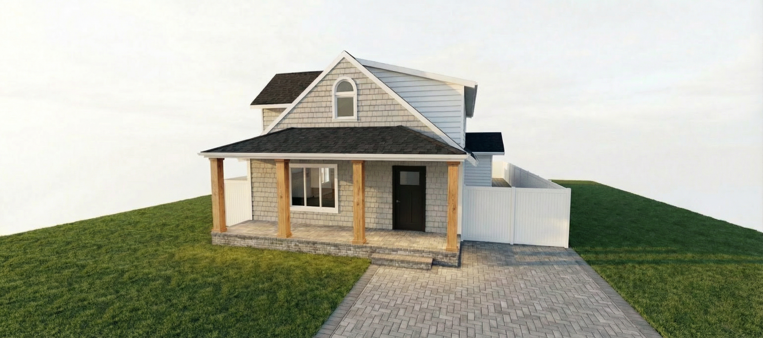 change the siding to a white board and batton on the front above the porch roof and a white cedar on the front below the porch roof line