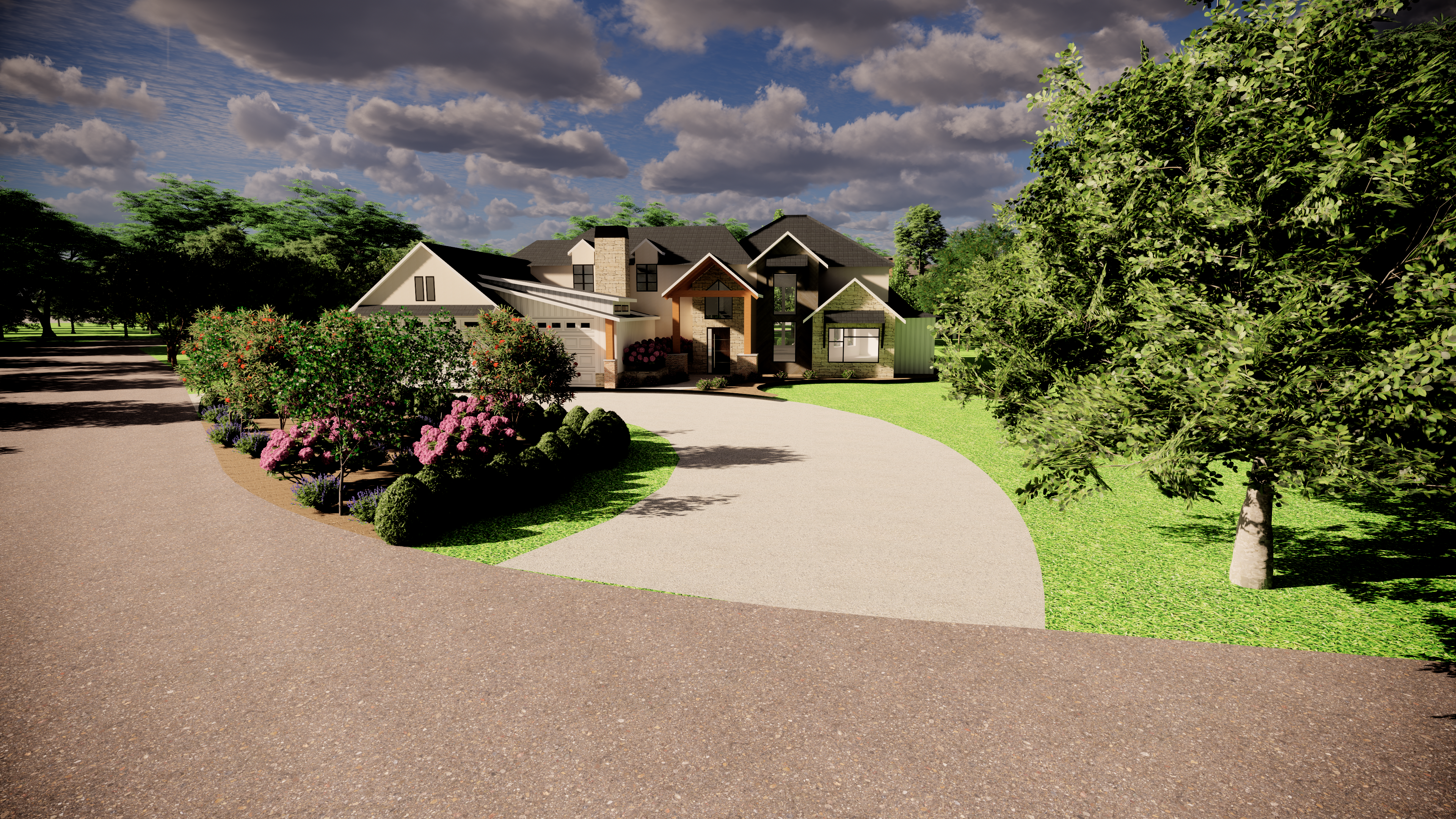 render a beautiful suburban house surrounded by lush greenery the house has a mix of beige cream and dark gray tones with a shingled roof the driveway is a smooth light beige leading to a two car garage bright colorful flowers in shades of pink red and purple border the lawn accompanied by neatly trimmed green shrubs tall leafy trees in vibrant shades of green surround the scene with a clear blue sky and fluffy white clouds above the atmosphere is serene and peaceful radiating warmth and tranquility