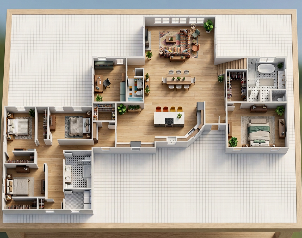 convert this floor plan into a realistic isometric 3d view of a full house show the space from an elevated angle with furniture walls and details visible master bedroom on upper right where pink and green couch is replace purple bed from dining room use the same furniture as shows on the plan do not change the orientation of the floorplan