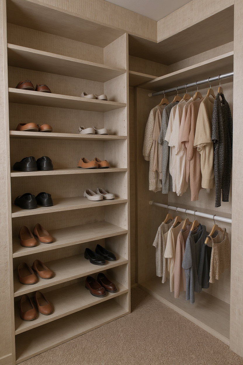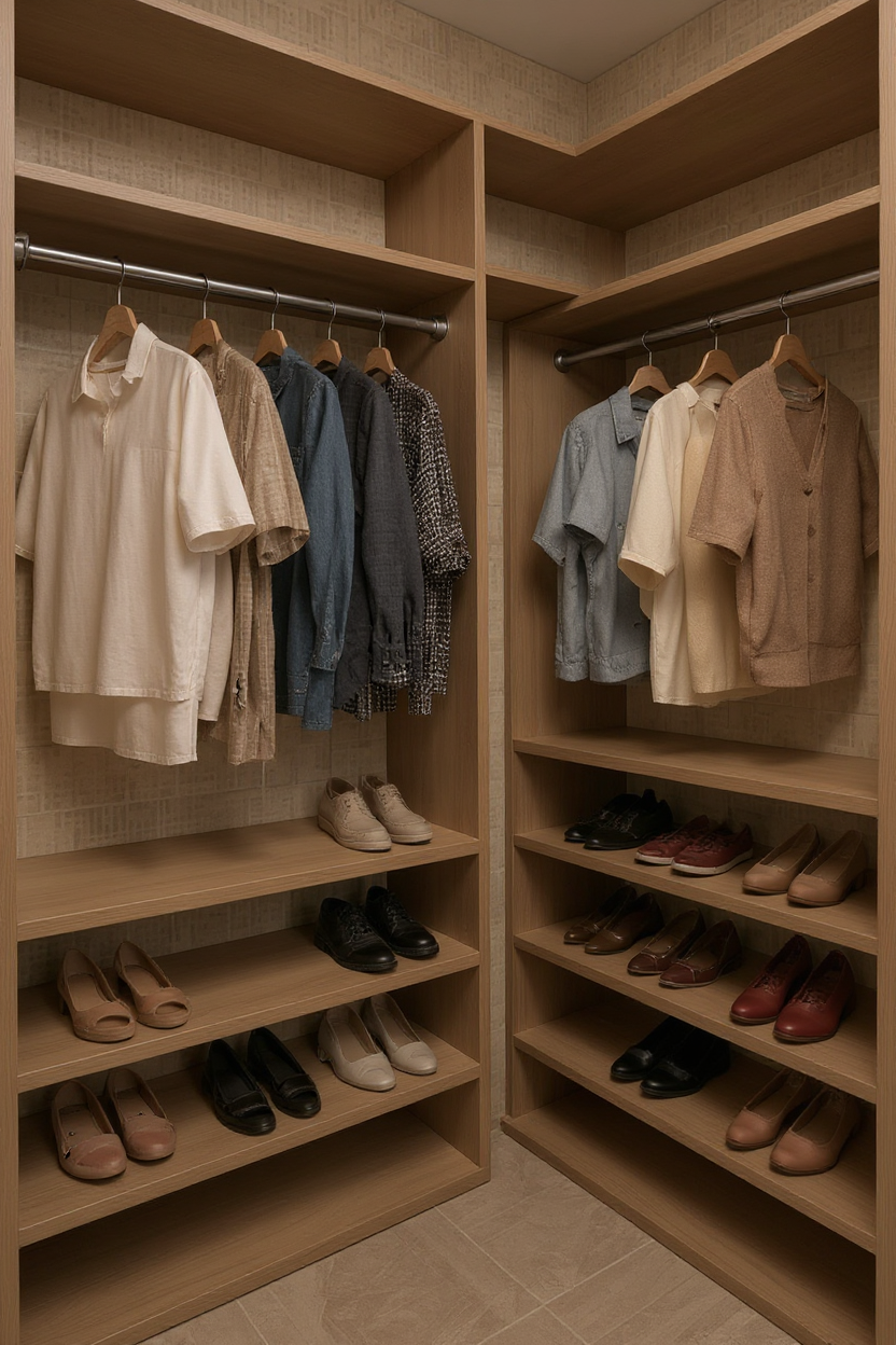 add clothes to the closet hanging rods the material of the built in unit is a light beige linen and gold add handles and knobs to the back unit ceiling ends at the top of the units