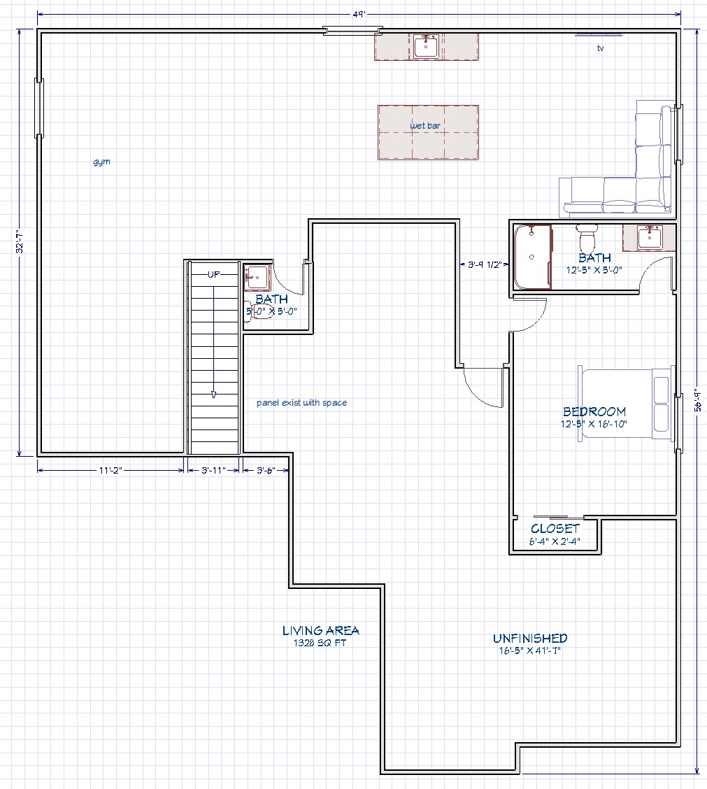 convert this floor plan into a realistic isometric 3d view of a full house show the space from an elevated angle with furniture walls and details visible make the basement an entertainers paradies ensure the gym is the full size of that area with gym equipment and rubber floor the wet bar very modern tv area next to it tile in bathroom and carpet in bedroom leave the large unfinished space with just studs exposed small bathroom next to the stairs use the same furniture as shows on the plan do not change the orientation of the floorplan