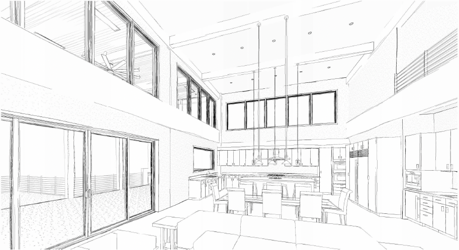 exterior shot render the sketch to match the same style and colors in the moodboard add a wood beam between the upper and lower windows that goes around the entire room