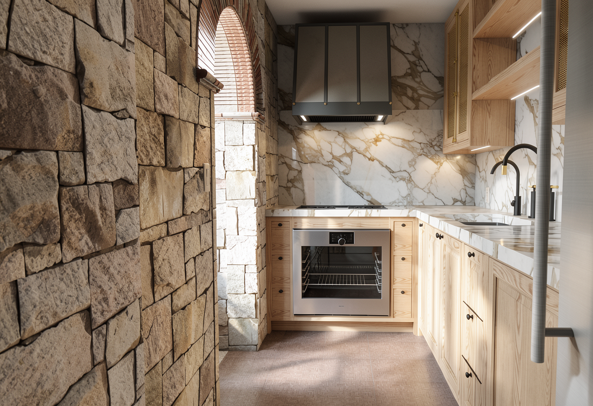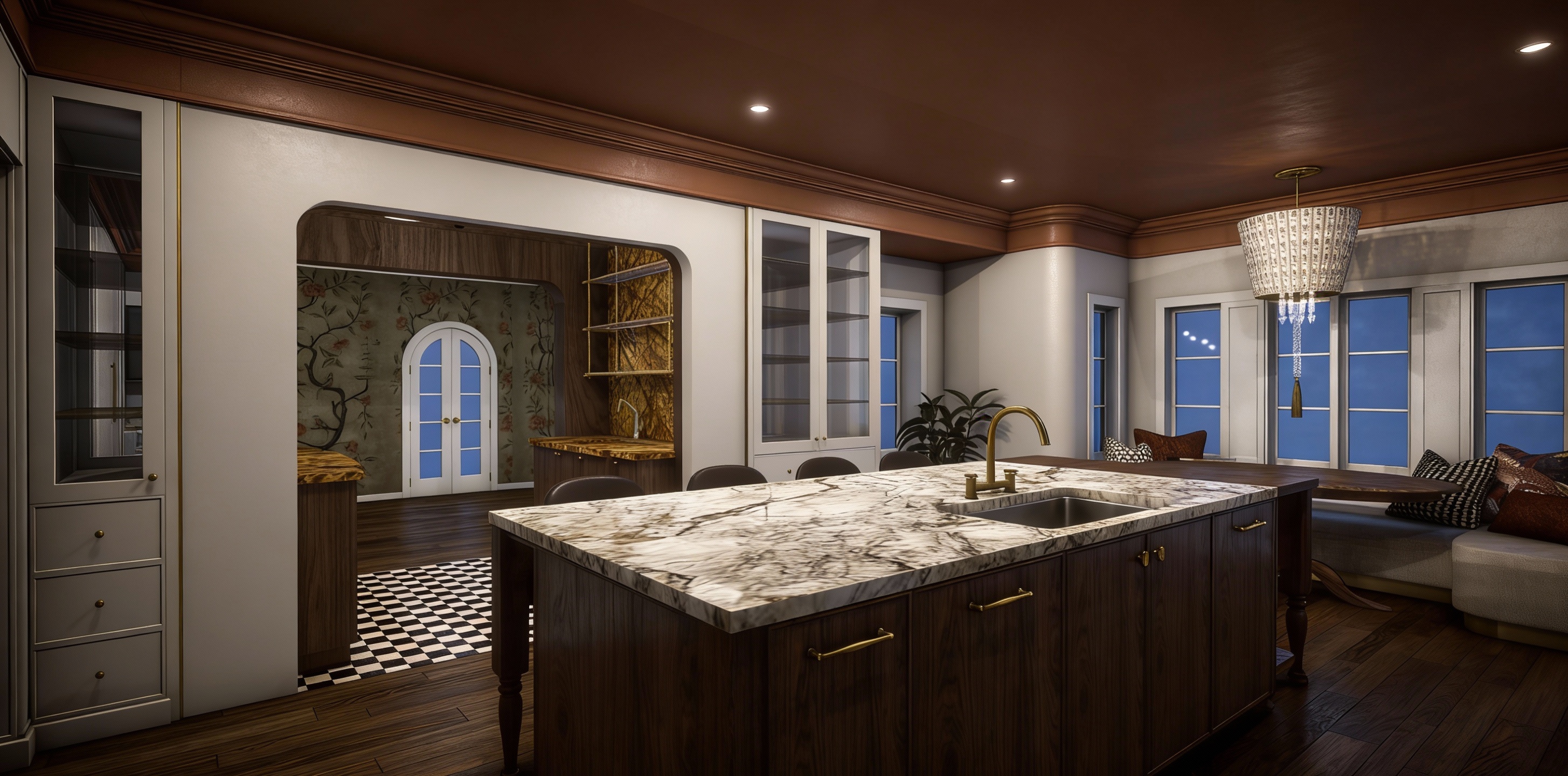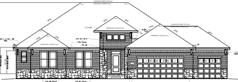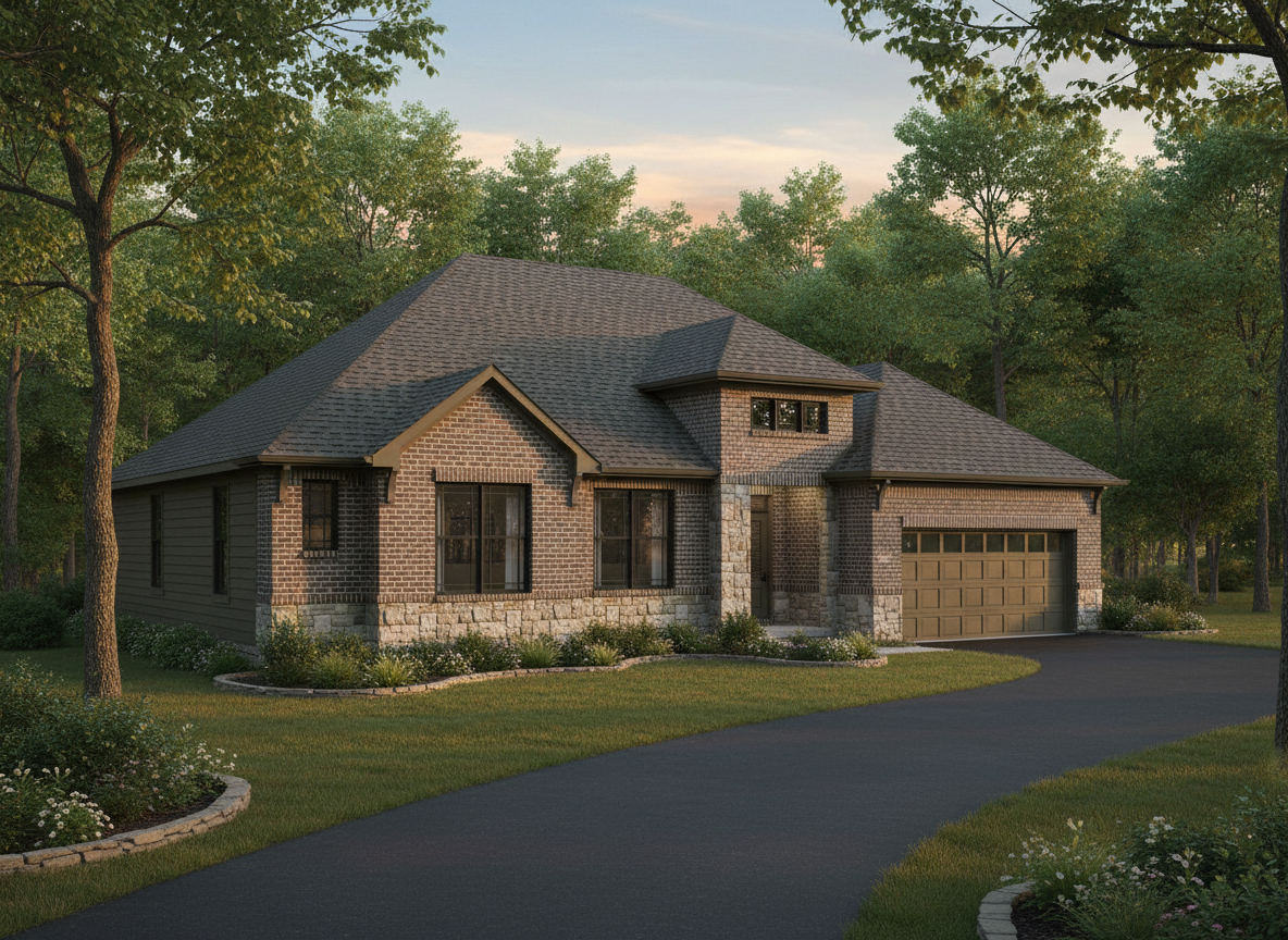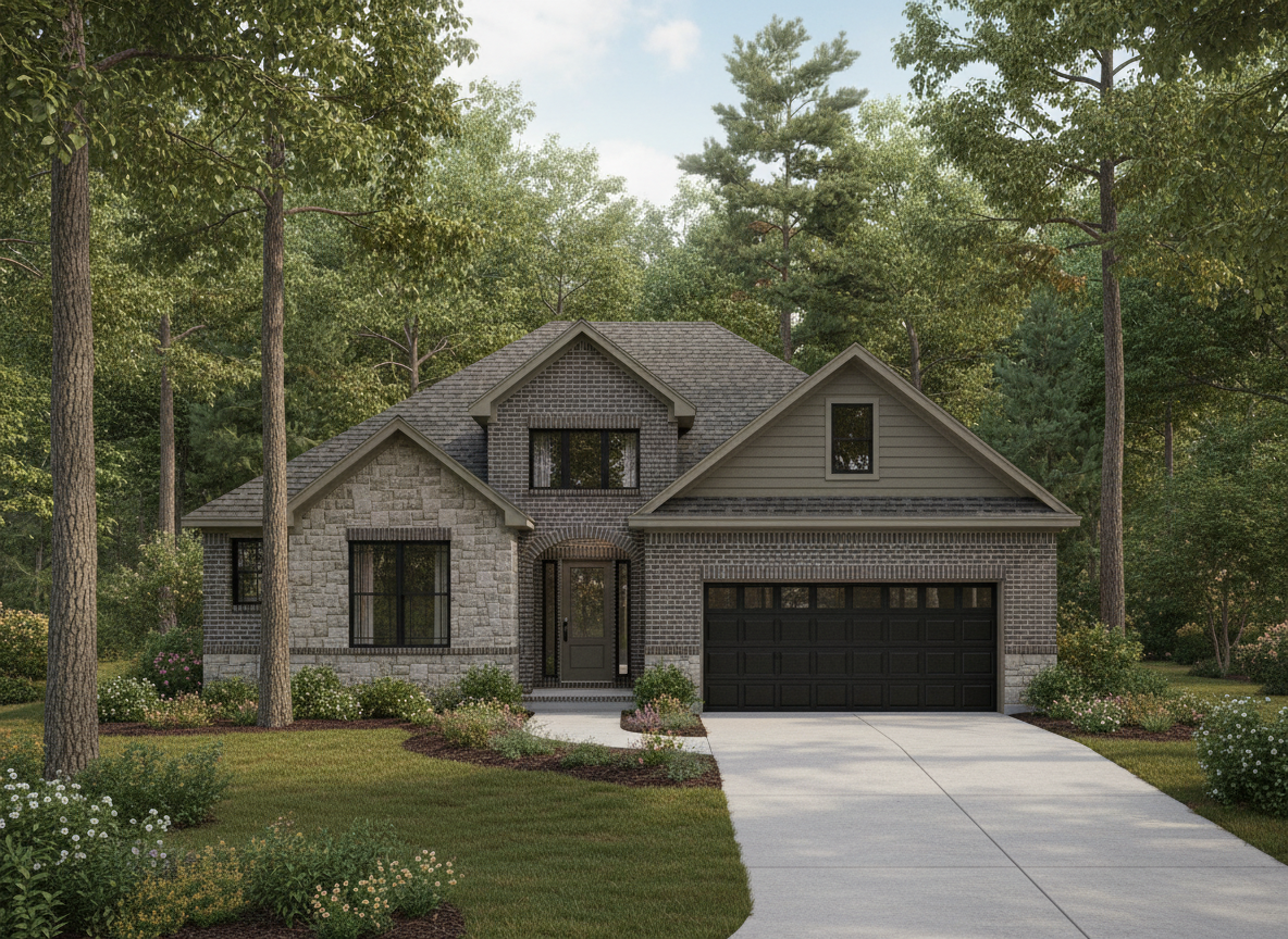 make a 3d model of this home on a wooded lot with landscaping that doesn t block the driveway brick is twilight blend color from the reference windows are black from the reference shingles are charcoal from the reference gutters are black from the reference stone is london gray from the reference siding is urban bronze from the reference trim is felted wool from the reference front door is urban bronze from the reference