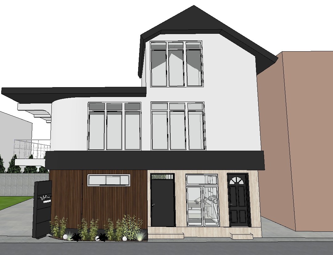 this is a cardiology office and you need to make a high quality render the ambient light should not be warm but more illuminated with natural light and 4000k light its exterior should look as real and high quality as possible the ground floor is used as a cardiology office while the upper floors are used as a residential building so the facade should distinguish the ground floor from the attic even the window panes on the ground floor should be blurred because the interior should not be visible while on the upper floors place white curtains in the interior the greenery should be real in front of the object and the white spheres are small lights while on the ground of the metal cap with aluminum a logo is placed and it is with white led light which should be clearly visible even from afar do not change anything in the design or anything else just make the render high quality and real activate two point perspective the window frames are white