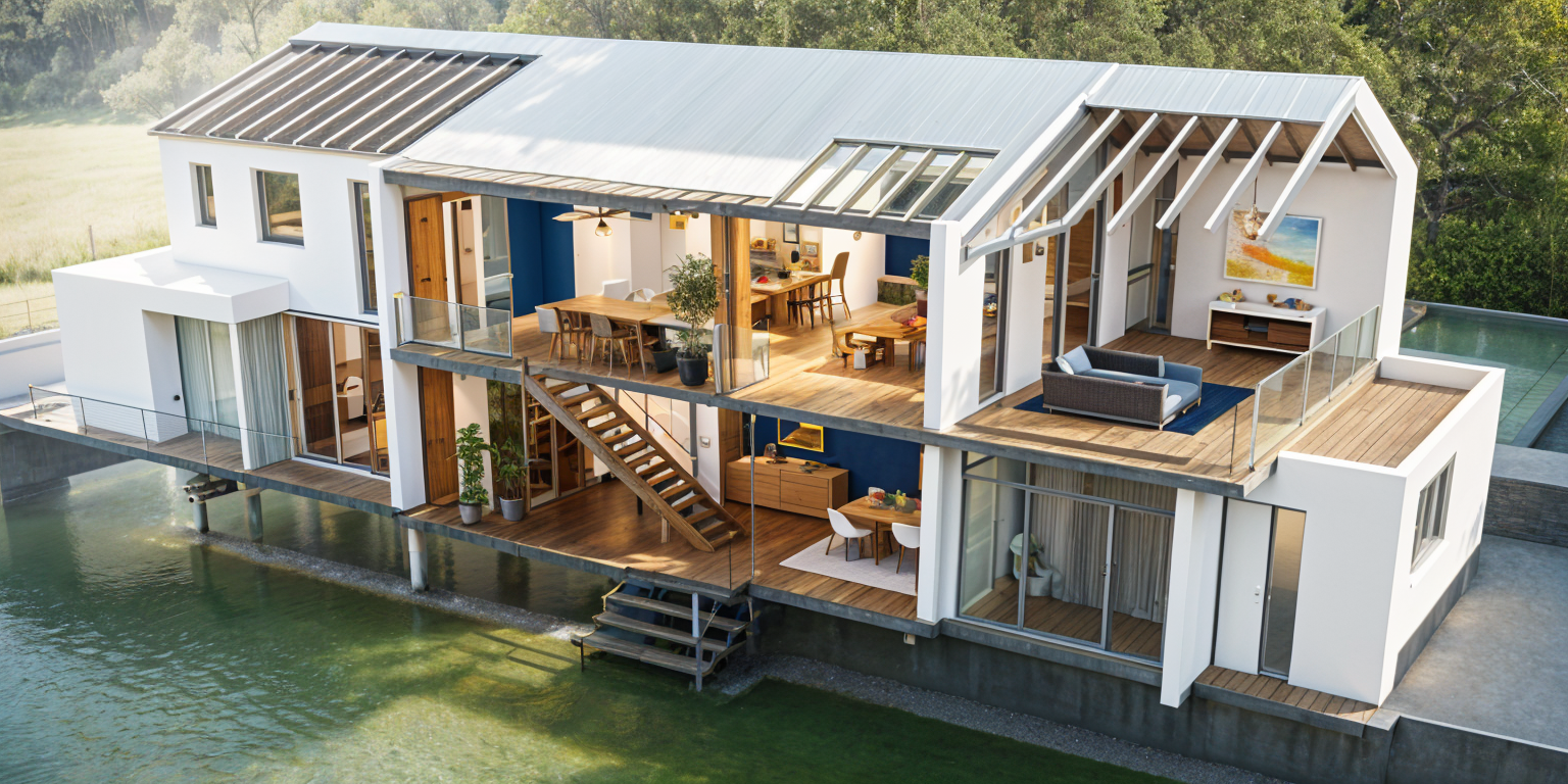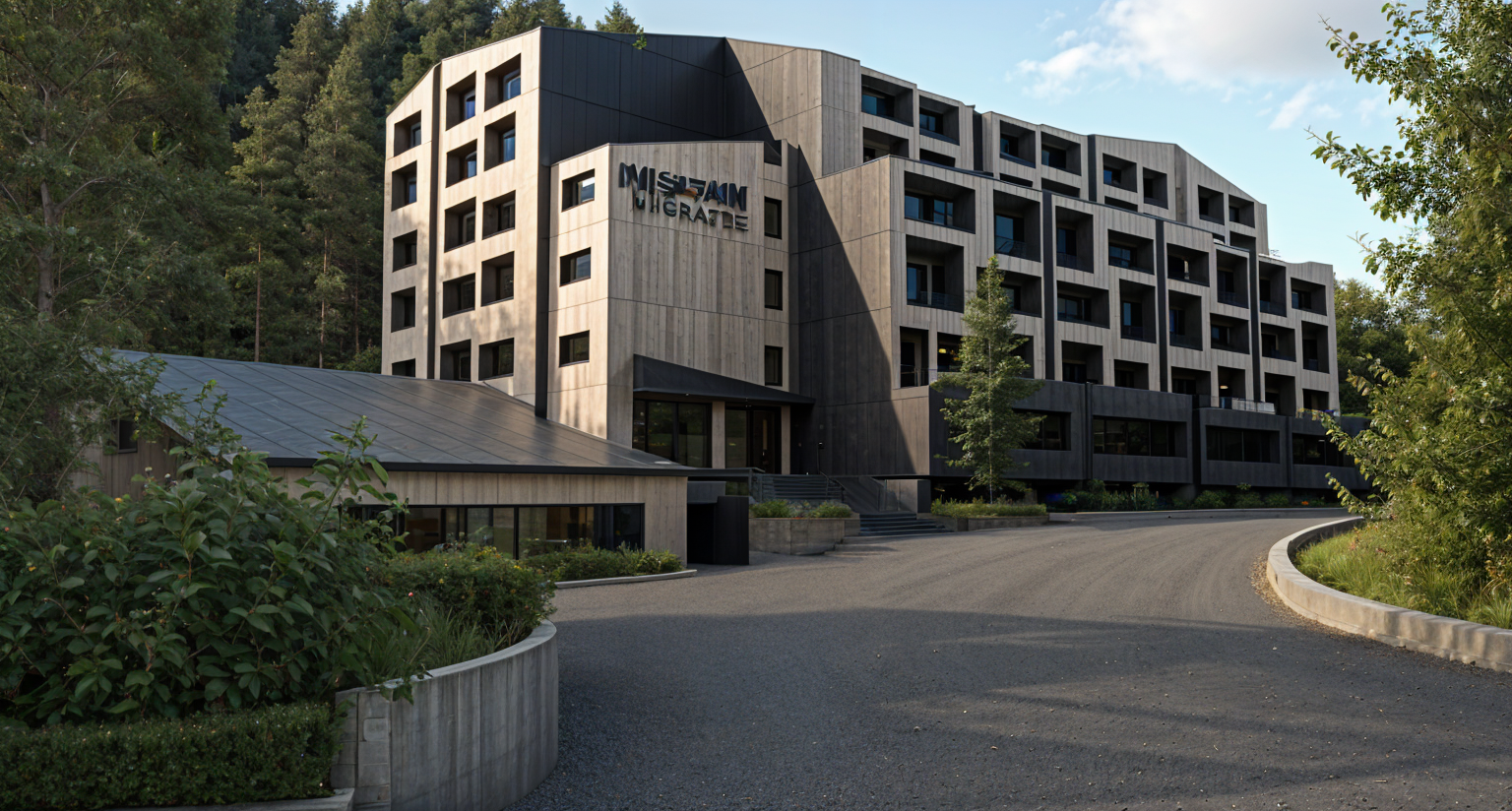 transform this sketchup style architectural render for web presentation remove the background and replace it with a subtle ambient environment to enhance realism maintain a monochrome or black and white aesthetic for the finishes while rendering the structure itself in soft realistic colour to highlight constructability enhance material details and lighting to reduce the flat digital look and make the image feel more photographic do not alter or distort any geometry or structural elements of the building the design must remain exactly as shown generate multiple variations with slight differences in ambience and lighting architecture