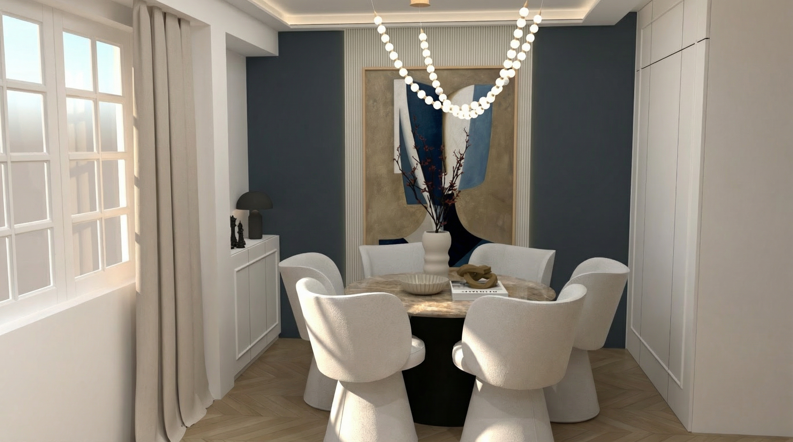 maintain all geometry create a hyper realistic interior rendering in the evening this is a second floor room facing south so the view out of the window should reflect that the painted casework should be a semi gloss finish the wood casework should remain as wood with a gloss finish the sconces should be lit in a 2700k temperature and a soft glow the ceiling should be a matt paint finish the item above the toilet is a sconce that should show as lit in the center but diffused from view and there is a circular marble plate on the back that should glow hang a towel from the wall hooks on the back wall the fixtures on the ceiling are square can lights with brass housings on a dim setting show a split shower curtain opened up behind the arch on the right side of the image with a can light on in the shower the curtain rod should not be visible as the curtain starts above the arch top