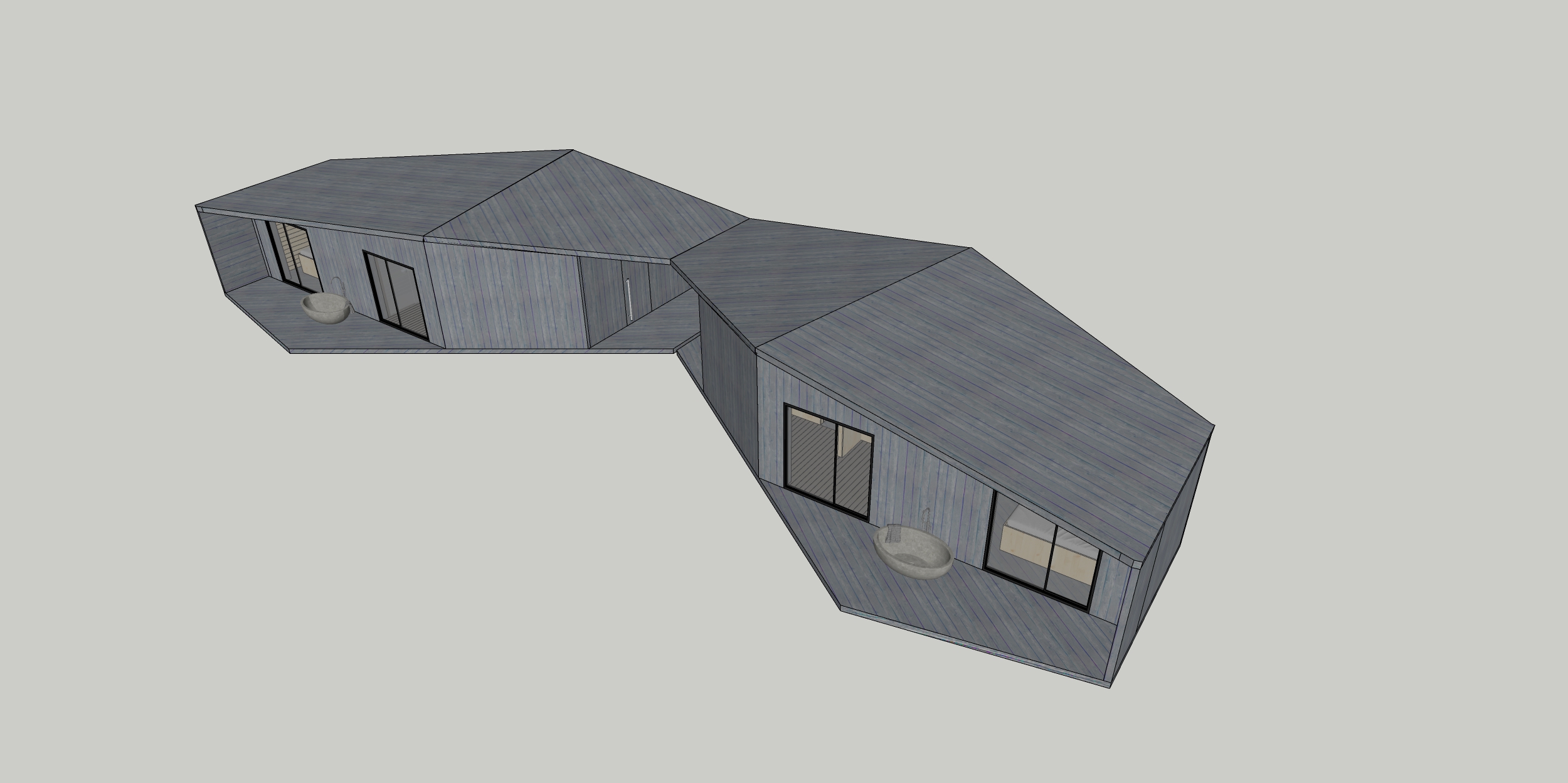 modernist exterior shot a beautifully rendered modern minimalist house set amidst a serene natural environment the house features wooden structures with a dark gray and black exterior large glass windows reflect the subtle hues of the surrounding landscape the wooden siding has warm earthy tones like soft browns and is combined with sleek contemporary black trimming the atmosphere is tranquil and the lighting is soft mimicking a gentle morning or late afternoon light the ground is adorned with patches of green moss and vivid yellow wildflowers adding a burst of color and life the surrounding trees are leafless drawn with delicate thin black lines indicating the late autumn season shadows of the trees create an intricate pattern on the house and the ground in varying shades of gray and brown the entire setting feels both modern and natural embracing simplicity and elegance architecture place these small cabins by a pond with the terrace directly connected to the water so it also serves as a wooden pier change the trees to have leaves it can be an autumn scene with warm colors the cabins should be made of dark charred wood shou sugi ban style with the planks appearing almost black natural peaceful atmosphere soft lighting reflections on the water cinematic composition