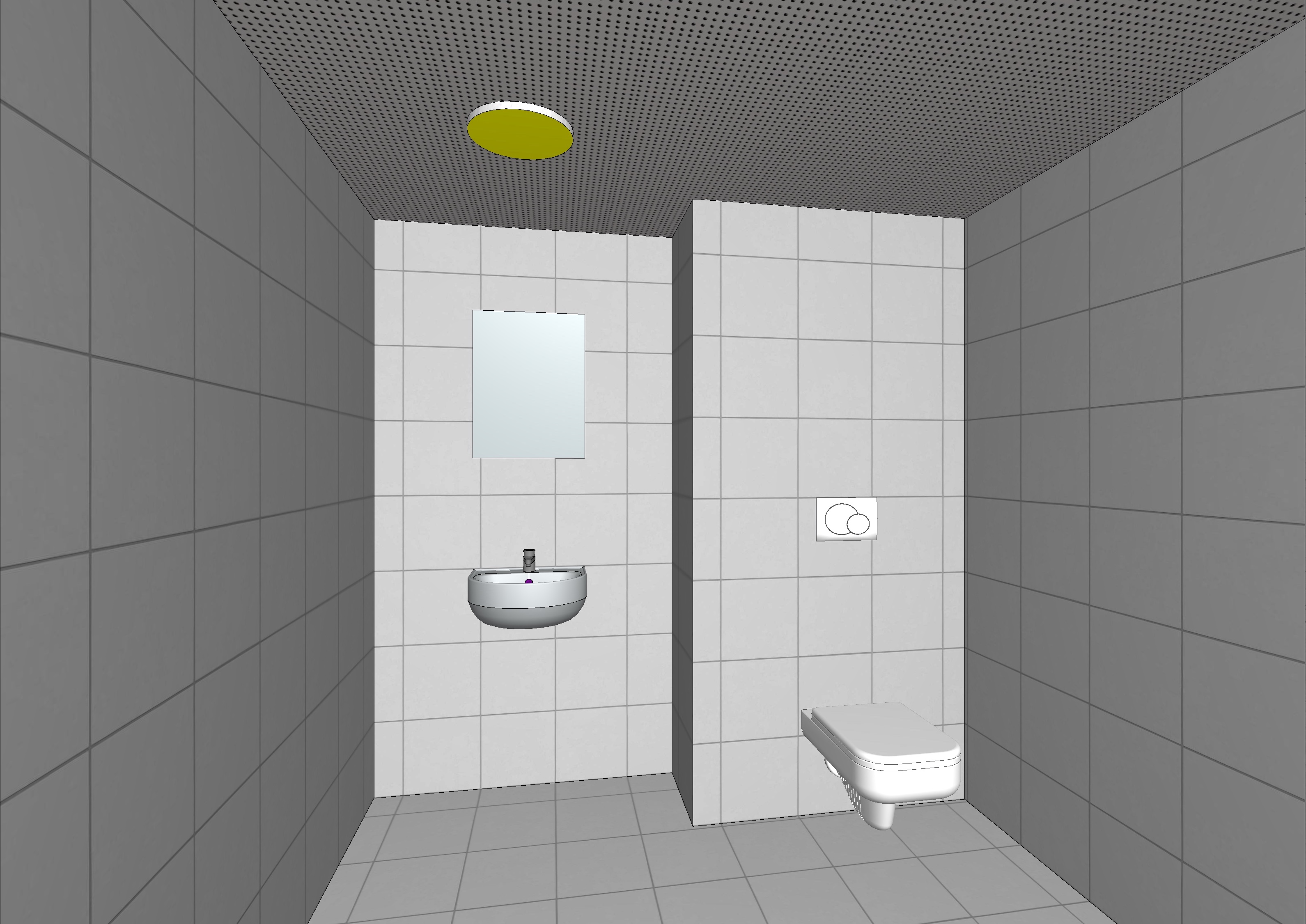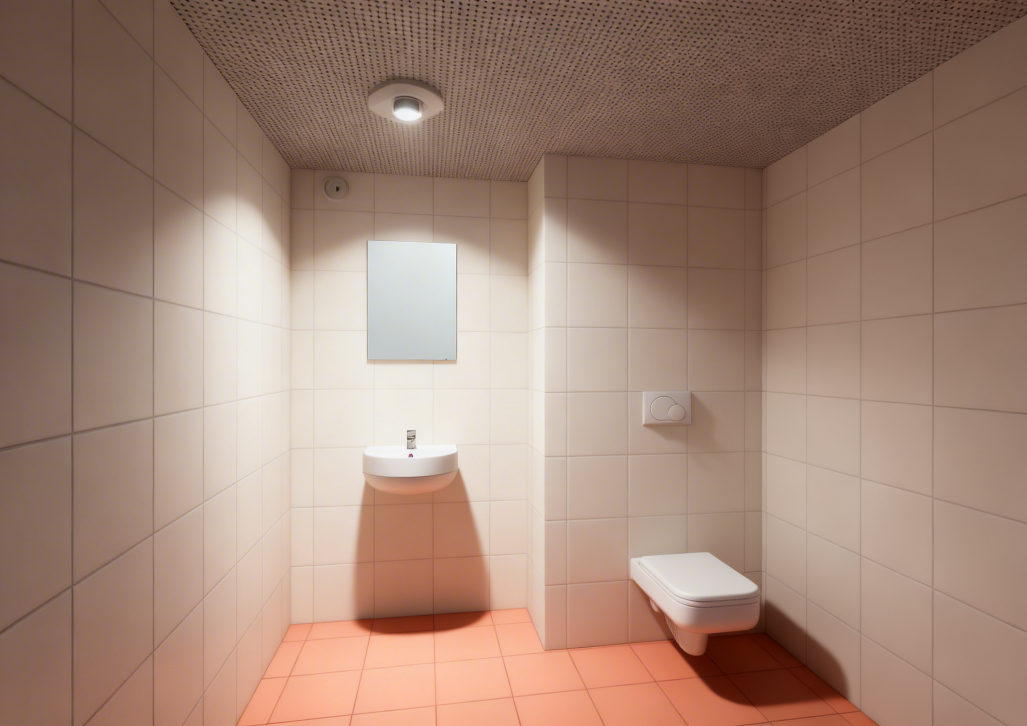 a realistic bathroom with the same layout as the original image the tiles are perfectly aligned starting from the left corner both the floor and the walls are covered with square tiles of 30x30 cm the floor tiles are a soft salmon orange color warm and slightly muted the wall tiles are an off white broken white color clean and elegant keep the proportions and structure of the bathroom identical to the original image but enhance the realism using only a single ceiling spotlight high quality textures the scene should look modern clean and photorealistic