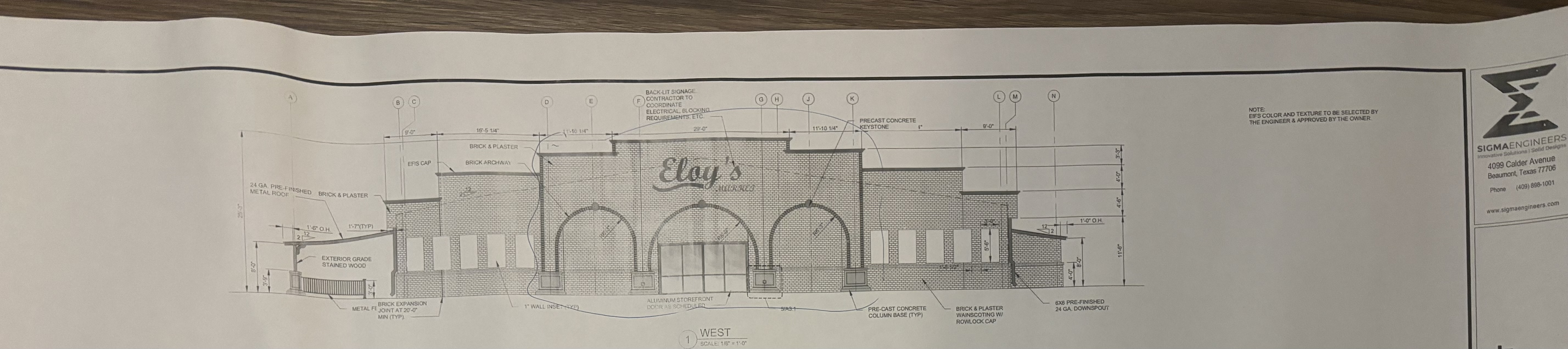 exterior shot white stone and dark brick copper metal roof trim signage is black metal