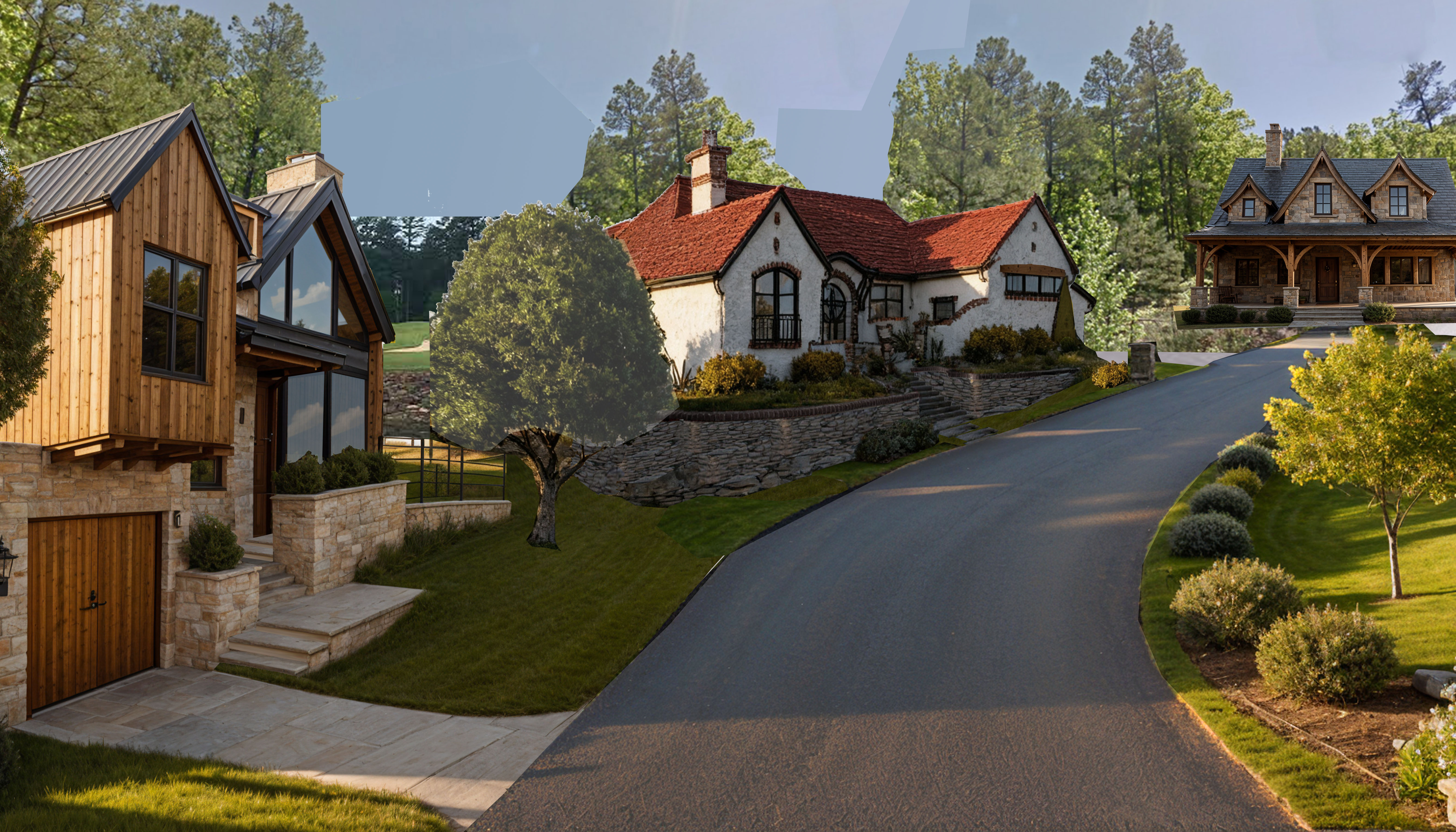 neighborhood in golf community show golf couse behind trees keep building materials the same