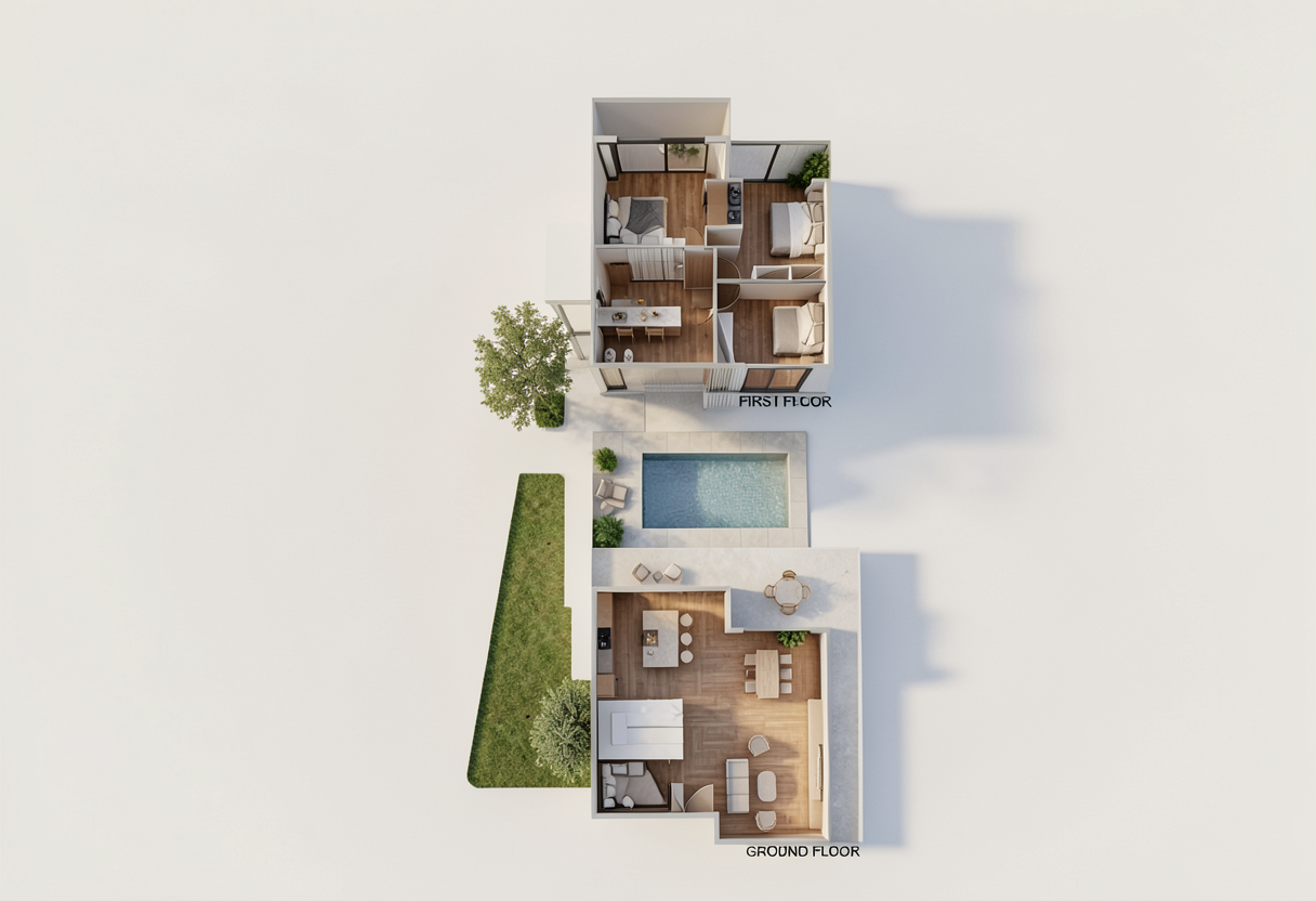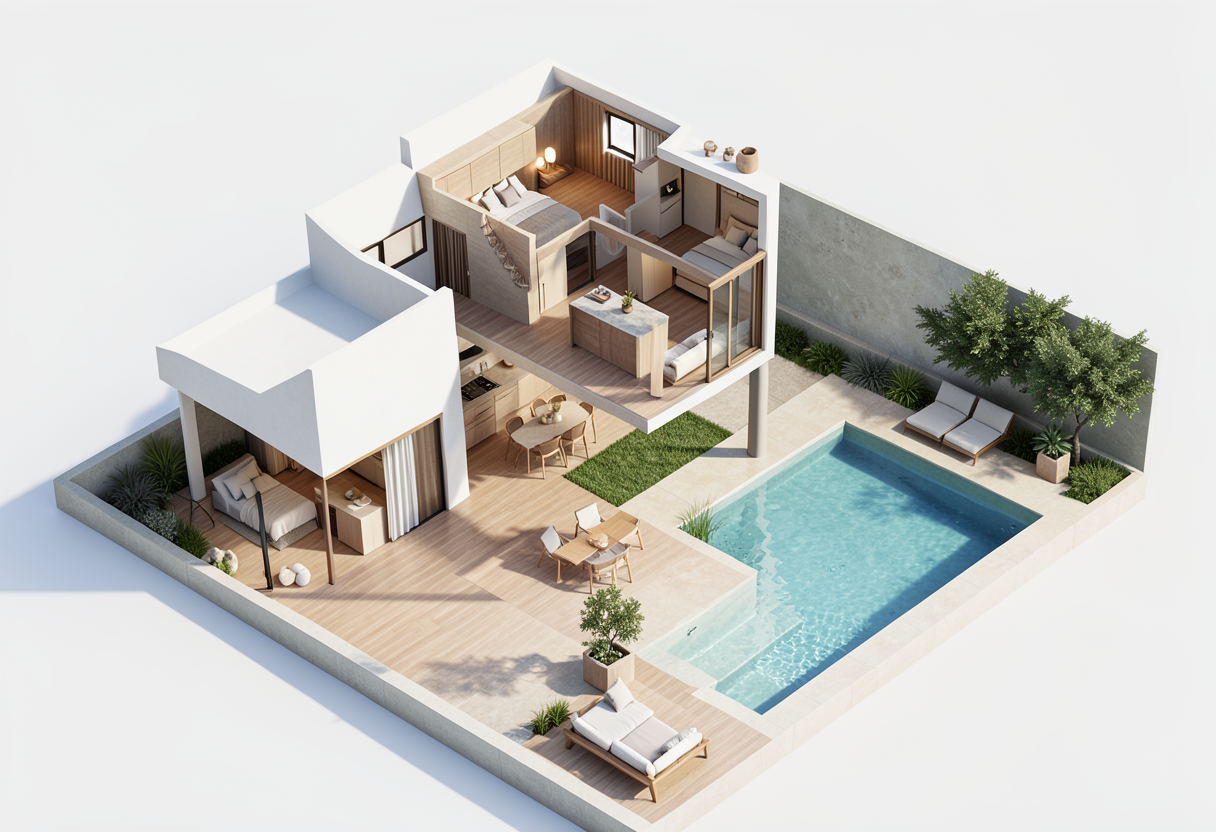 create a vibrant summer villa with an aerial view featuring a modern architectural layout emphasize the vivid blue of the pool surrounded by warm beige tiles the house should have sleek bright white walls with large windows reflecting sunlight use soft gray for interior flooring and vibrant green for plants in the garden area highlight a sunlit open dining area with light wooden furniture render an inviting airy atmosphere evoking tranquility and luxury