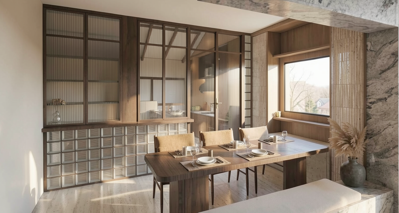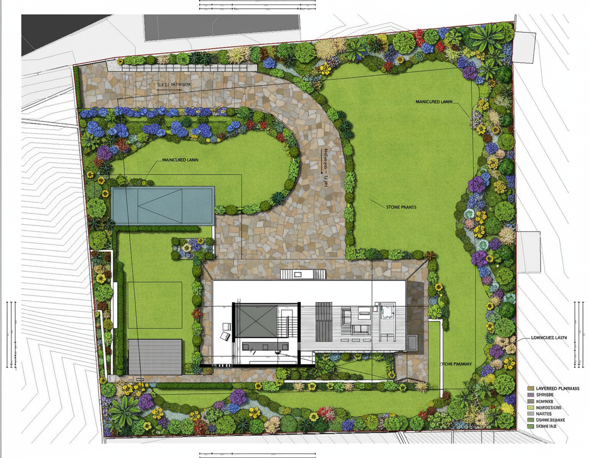 terrazza con divano in tessuto bianco caldo e cuscini sui toni del blu scuro tavoli e tavolini in legno teak e cucina con piano di lavoro fianchi e mensola in gr s effetto pietra gli sgabelli e gli elettrodomestici della cucina sono cromati la mensola della cucina ha una strip led sotto che illumina il piano di lavoro nella pergotenda sopra al divano c una strip led incassata perimetrale accesa attorno alla vasca idromassaggio ci sono delle siepi metti uno sfondo con case con chiome di alberi e colline in lontananza al tramonto metti qualche oggetto per ambiente conviviale esterno