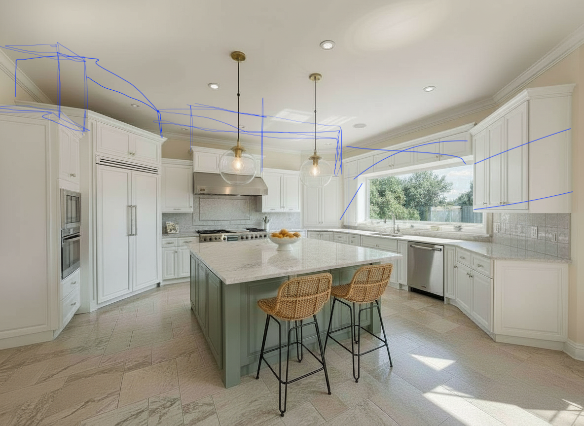 please turn the cabinets on the right in open shelves with art and decor and remove the cabinets over the window and next to it and make all other cbainets go to the ceiling