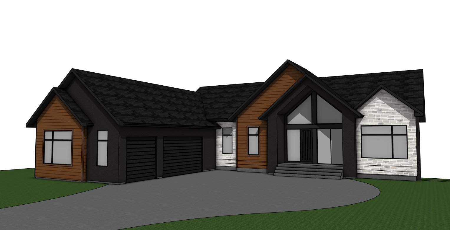 in the distant background behind home is a large river large oak and elm trees line the river and are in the back yard of the home there is some small subtle landscaping in the fron comprised of small shrubs and flowers sun is setting in the background dark material is acrylic stucco brown material is wood look siding that is very dark brown espresso black almost and light material is limestone