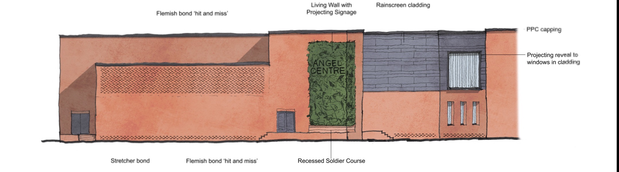 render a modern architectural building with a warm welcoming atmosphere the structure is composed of a flemish bond hit and miss brick facade in a soft terracotta color contrasted by ppc capping in a dark gray the rainscreen cladding is a gentle slate gray include large glazed windows with a faint blue tint the living wall features lush green foliage with the words angel centre subtly integrated the base of the building has stretcher bond brickwork in a deeper terracotta hue the overall ambiance is inviting and contemporary with natural light enhancing the facade s texture
