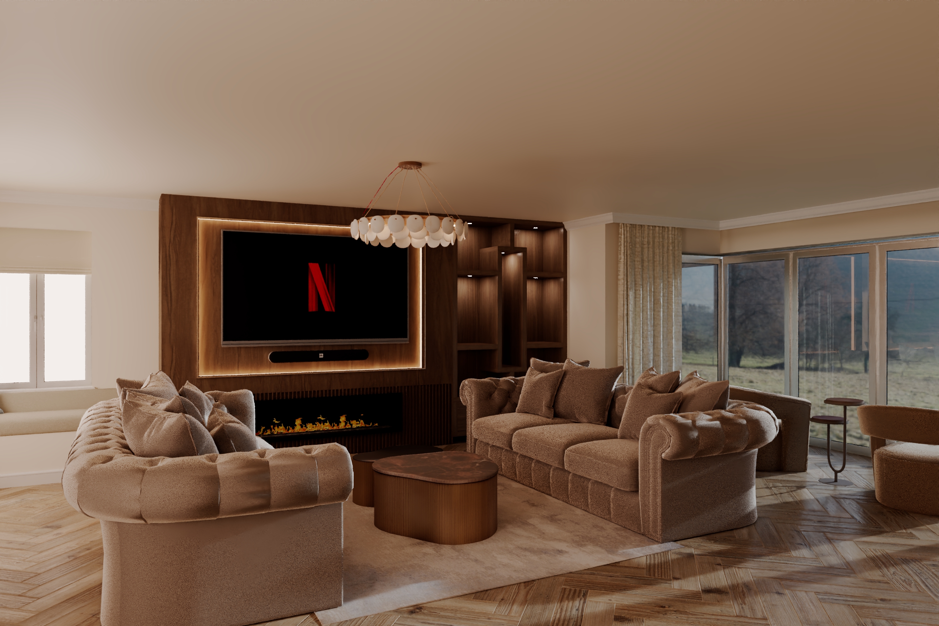 make sure the wood stays as is but slightly lighter improve the lighting make the sofa seamless light grey velvet add decor into the wooden shelves make the wood slightly lighter make the fireplace stand out make outside view less dark
