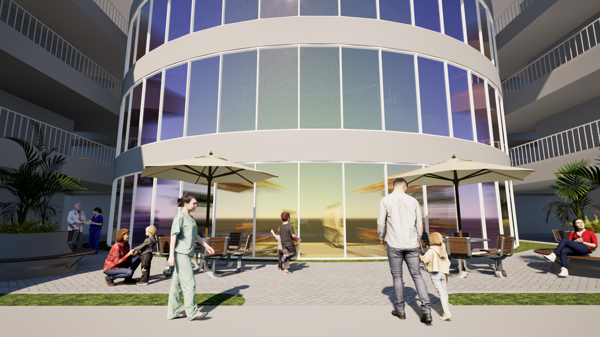 keep the characters and the polychrome glass add greeneries on the grass area make it lively with colorful plants change the pavement colors make it neutral change the material of the walls