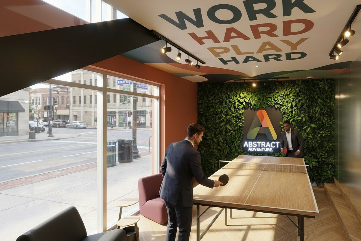 make the lettering under abstract to say advertising keep it white and illuminated change the red chair behind the guy to black leather like the other one