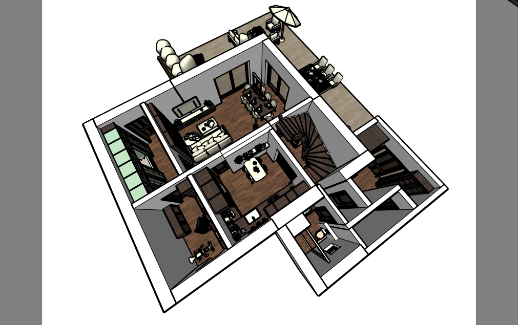 create a highly realistic monochromatic 3d architectural model based strictly on the provided reference image do not change the layout geometry proportions walls stairs openings or furniture placement do not add remove or replace any furniture or architectural elements the model must remain identical in spatial layout and content to the reference style requirements strictly black and white grayscale only no colors no tints no materials with color use realistic light and shadow contrast to define depth subtle variation in grayscale values to differentiate materials matte realistic surfaces no glossy or stylized look rendering quality photorealistic architectural visualization realistic global illumination soft natural lighting accurate scale and proportions clean professional architectural presentation overall goal transform the existing model into a more realistic high end monochromatic architectural visualization without altering its design layout or furniture in any way